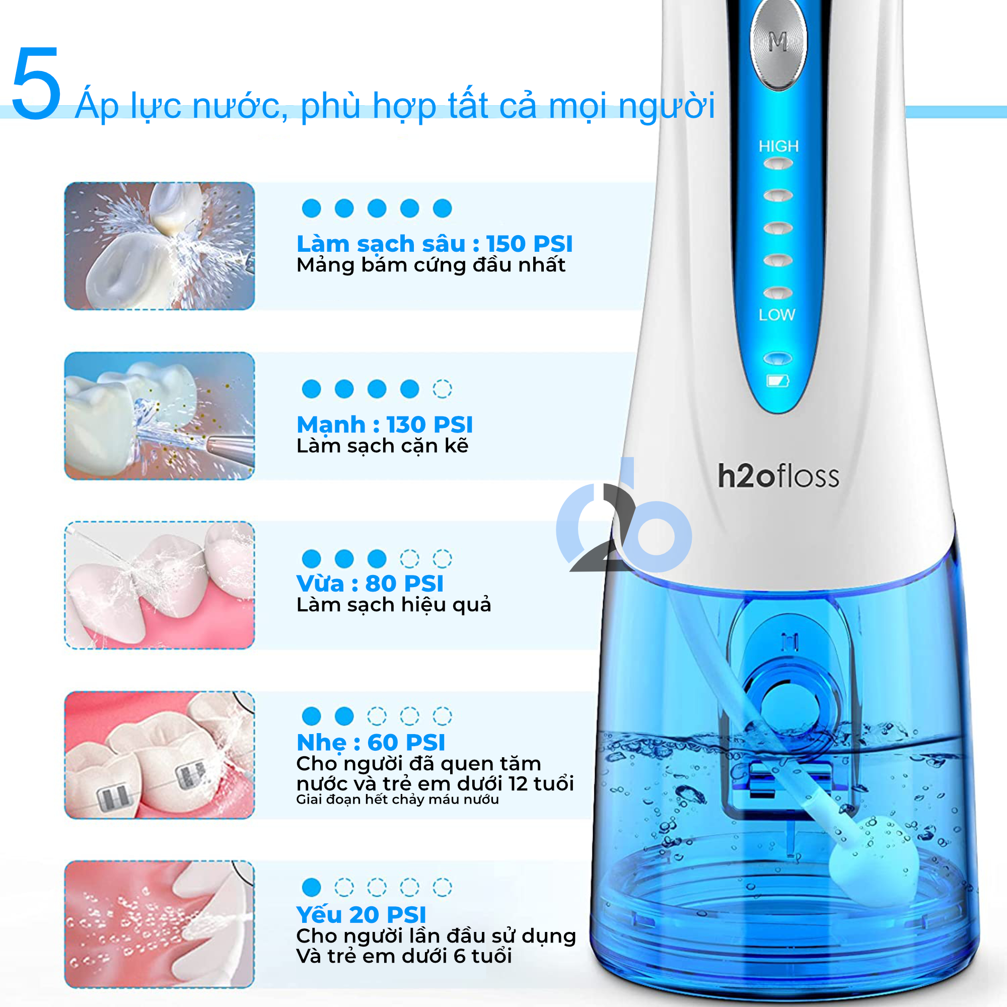 - Sử dụng nước với áp lực cao để tẩy rửa đồ ăn còn bám lại -Đặc biệt chế độ nước yếu nhất chỉ 20 psi, Trẻ em từ 6 tuổi hoàn toàn sử dụng được, đơn giản và cực kì hiệu quả. Các máy tăm nước khác trên thị trường có mức độ yếu nhất lên tới 50 psi, không phù hợp với trẻ em vì tia nước quá mạnh