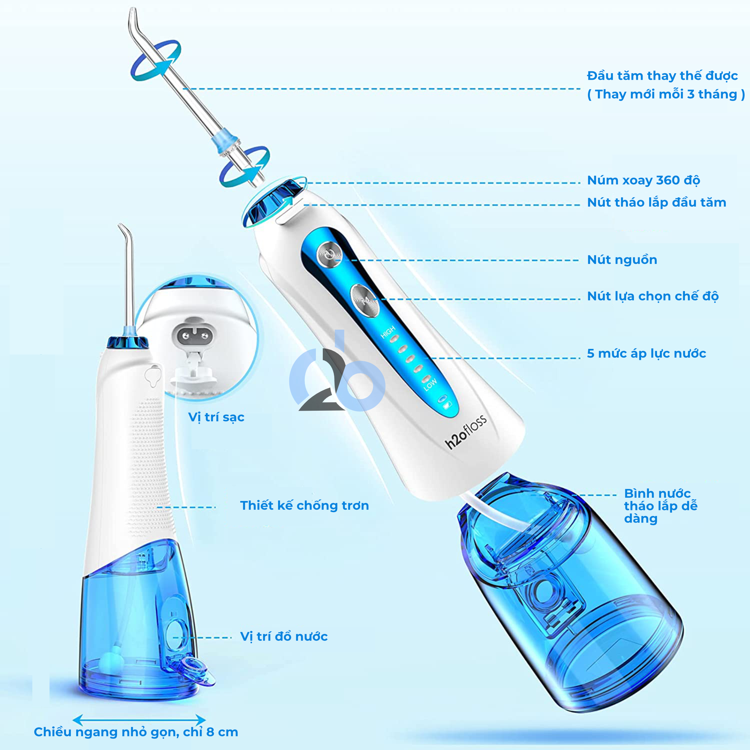 ✨Tăm nước cầm tay H2ofloss HF-2 phiên bản nâng cấp được phân phối độc quyền với nút mở bình nước tiện lợi, tặng kèm 7 đầu tăm, củ sạc nguồn thấp