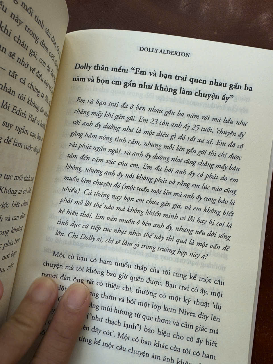 Từ đầu năm 2020, Dolly Alderton đã chia sẻ sự khôn ngoan, ấm áp và dí dỏm của mình với vô số người đã viết thư cho chuyên mục tư vấn "Dear Dolly" của cô trên tờ The Sunday Times Style. Những câu hỏi của họ trải dài từ những nỗi đau - và đôi khi là những niềm vui - cho đến những điều kỳ quặc. Chúng bao gồm những chia tay và vấn đề về cơ thể, gia đình, tình bạn, hẹn hò, ly hôn, những niềm vui và cạm bẫy của mạng xã hội, tình dục, sự cô đơn, khao khát, tình yêu và mọi thứ ở giữa.
