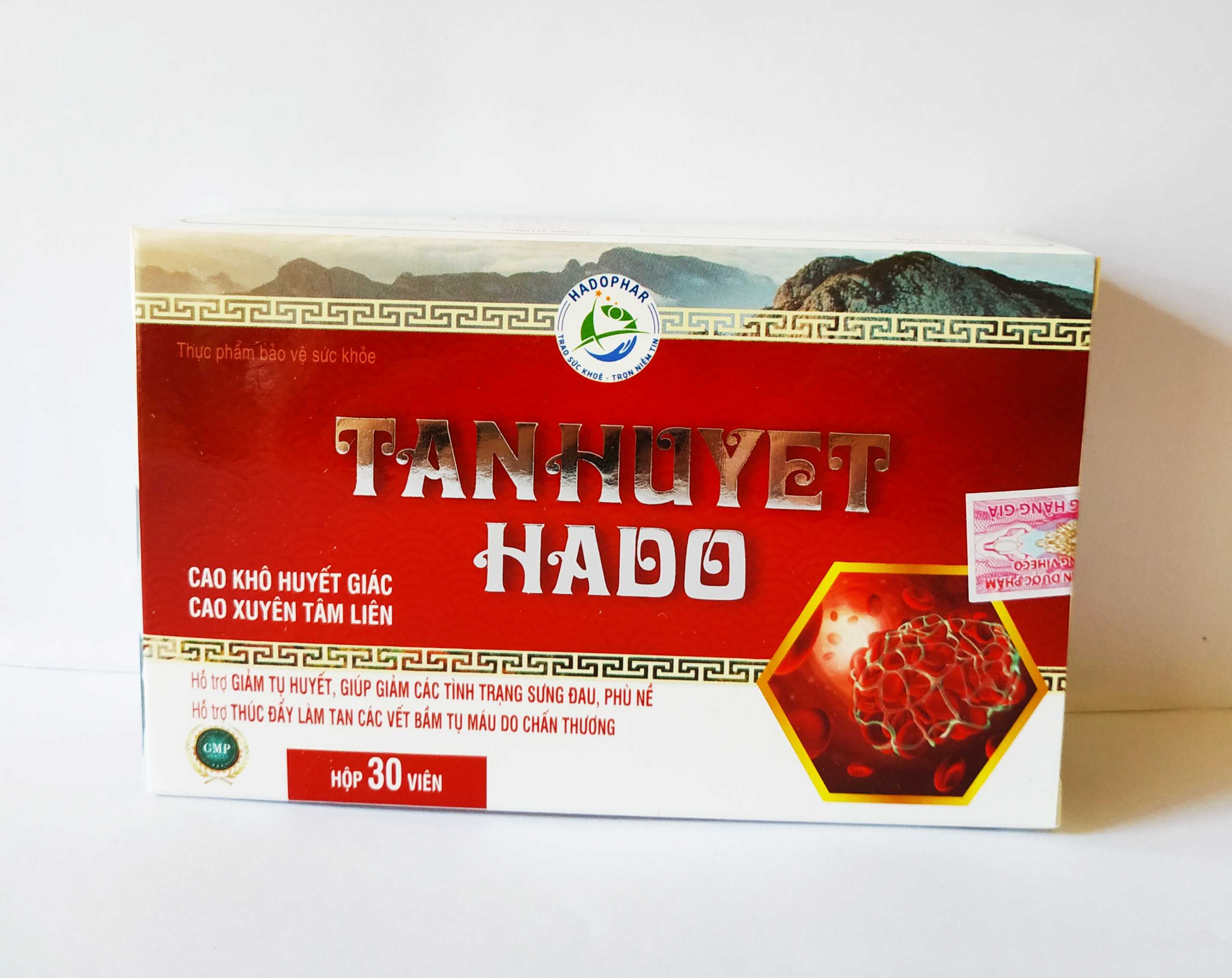 - Làm tan các vết bầm tím, tụ máu sưng đau do chấn thương, va đập, bị đòn, té ngã, tai nạn lao động, hoạt động thể thao. - Tiêu sưng, giúp các vết xây xát, vết loét, mụn nhọt, vết thương hở nhanh lành, chóng liền sẹo. - Bầm tím do thẫm mĩ: như nâng mũi, cắt mí, xăm chân mày, xăm môi Uống TAN HUYẾT HADO mau lành , tan máu bầm nhanh mà ko cần đến thuốc Tây Thích hợp cho những bạn đi phẫu thuật thẫm mỹ mà không muốn dùng thuốc tây. ĐỐI TƯỢNG SỬ DỤNG: Người bị sưng nề, bầm tụ do chấn thương, tổn thương mô mềm cần thúc đẩy nhanh liền sẹo. Người sau phẫu thuật thẩm mỹ: như xăm môi, xăm chân mày, nâng mũi… THÀNH PHẦN: Cao huyết giá Cao cúc dạ Cao xuyên xuyên tâm liê Cao rẻ quạ Phụ liệu khác vừa đủ 1 viên CÁCH DÙNG: Người lớn: uống 2 viên/lần, ngày 2-3 lần QUY CÁCH ĐÓNG GÓI: Hộp 3 vỉ x 10 viên