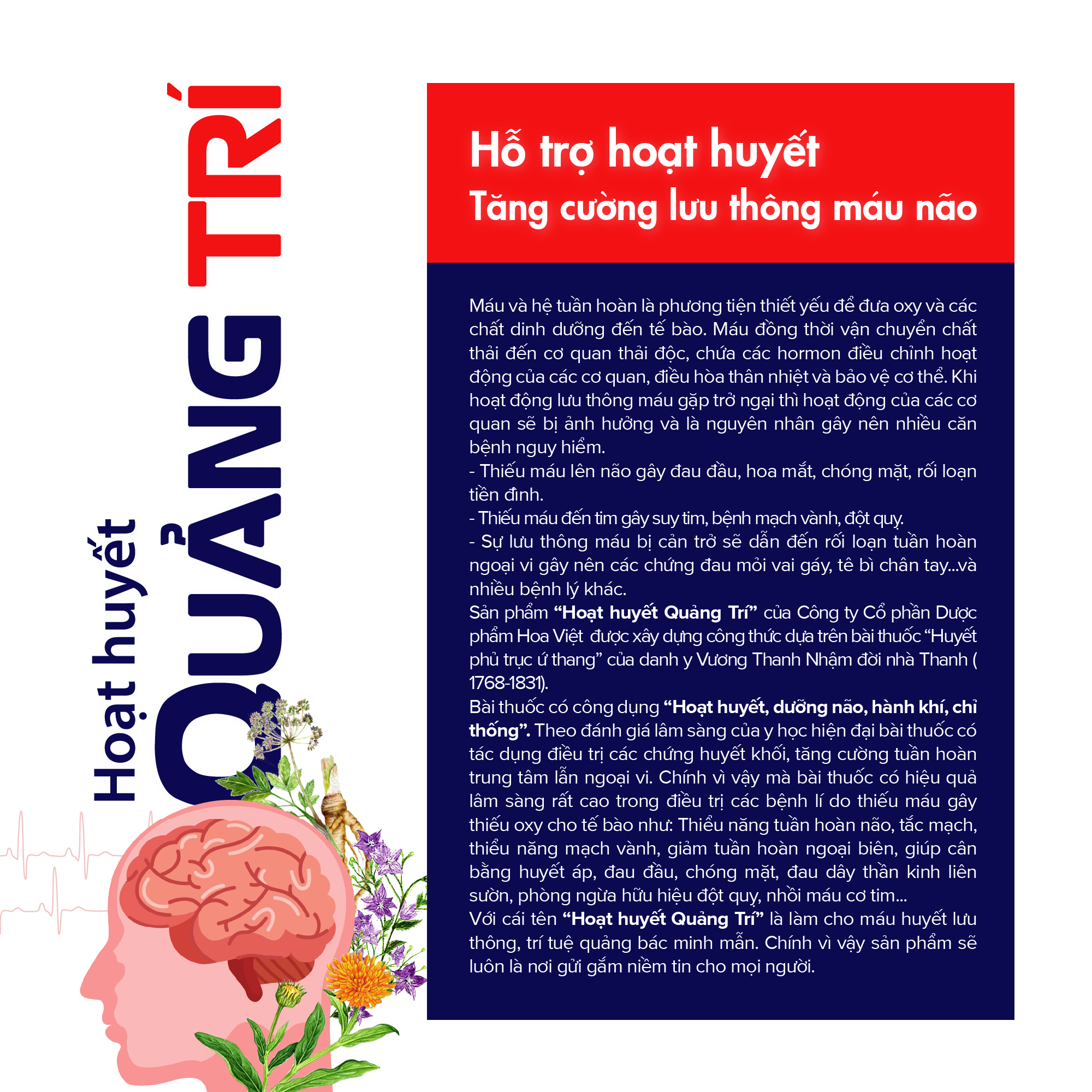 - Hoạt huyết Quảng Trí Hoa Việt là sản phẩm được bào chế từ các thảo dược thiên nhiên quý hiếm, có tác dụng hỗ trợ lưu thông máu não, cải thiện trí nhớ và tăng cường chức năng não bộ.