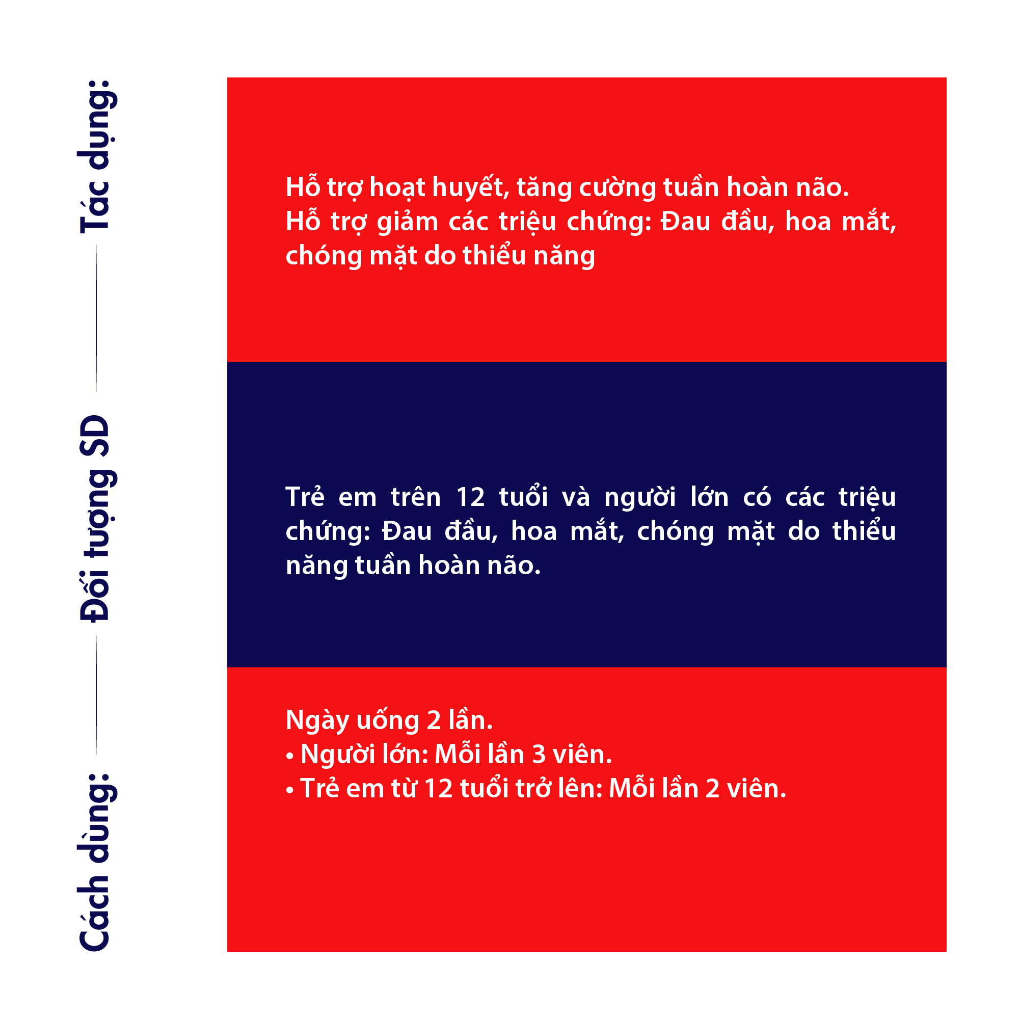 Thành phần Công dụng Hỗ trợ hoạt huyết, tăng cường tuần hoàn máu não, giảm các biểu hiện do thiểu năng tuần hoàn. Hỗ trợ giảm các di chứng sau tai biến mạch máu