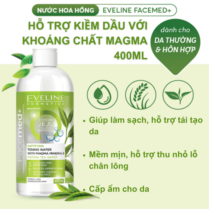 - Toner Eveline Facemed+ kiềm dầu với khoáng chất Magma 400M Bộ quà dưỡng da Eveline (Kem dưỡng toàn thân + Nước hoa hồng) 200- 400ml sẽ giúp bạn có được làn da căng bóng, mềm mướt mà không lo tình trạng kích ứng. Công Dụng