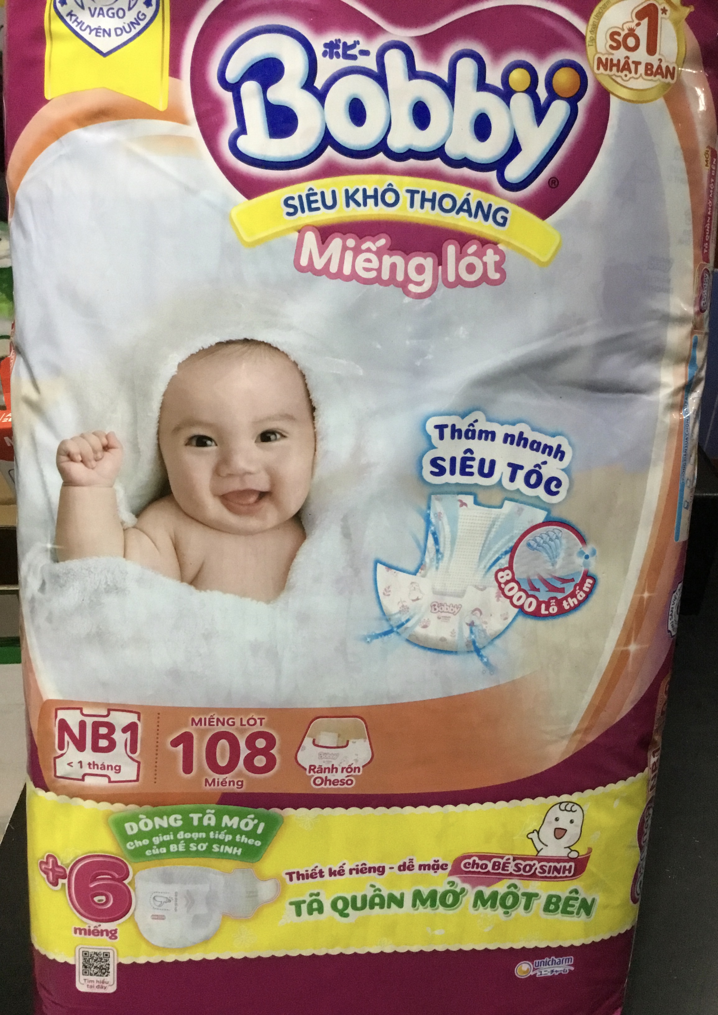 Miếng Lót Bé Sơ Sinh Bobby Newborn 1 (NB1 108 ) 108 Miếng Cho Bé Lớn Dưới 1 Tháng - Tã Lót Trẻ Sơ Sinh NB 1 < 1 Tháng Miếng lót Bobby size Newborn 1 108 miếng là sản phẩm dành cho bé sơ sinh dưới 1 tháng tuổi thuộc thương hiệu Bobby đến từ tập đoàn Unicharm Nhật Bản. Miếng lót sơ sinh Bobby Newborn đột phá với giải pháp chống hăm toàn diện cùng khả năng thấm hút vượt trội. Chất liệu Vải không dệt, Hạt siêu thấm, Bông cellulose, PE, Chun, Polyme kết dính, Giấy tráng Silicon, Vitamin E dưỡng da Đặc điểm nổi bật Lớp thấm nhanh siêu tốc Miếng lót Bobby Newborn 1 cải tiến hơn về công nghệ giúp bề mặt với 8.000 lỗ thấm hút siêu nhanh cho da bé luôn khô thoáng Rãnh rốn Oheso Thiết kế rãnh hạn chế tối đa tiếp xúc giữa tã và cuống rốn, bảo vệ vùng rốn bé luôn khô thoáng Màng đáy xốp êm Màng đáy dạng vải êm mềm, thoát ẩm, cho da bé hô hấp tự nhiên, giảm nguy cơ hăm tã Bề mặt Cotton-Soft Bề mặt siêu mềm mại với Cream Vitamin E chăm sóc nhẹ nhàng cho làn da bé sơ sinh Hướng dẫn sử dụng Hướng dẫn chọn miếng lót Size NB1( Newborn 1): bé dưới 1 tháng Size NB2 ( Newborn 2): bé trên 1 tháng Hướng dẫn bảo quản Bảo quản nơi khô ráo, tránh bụi và ánh nắng trực tiếp