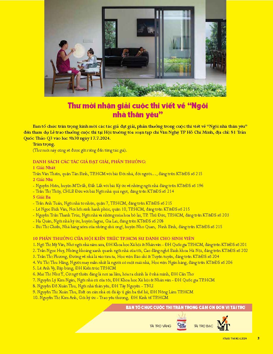 Liên quan đến cuộc thi viết về Ngôi nhà thân yêu, ấn phẩm Kiến trúc & Đời sống xin được công bố: Lễ trao giải sẽ được tổ chức vào lúc 9 giờ 30 ngày thứ tư, 17.7.2014 tại hội trường tạp chí Văn Nghệ TP. Hồ Chí Minh. Địa chỉ: 81 Trần Quốc Thảo, Q.3. Chúng tôi sẽ có thư mời đến từng tác giả đạt giải.