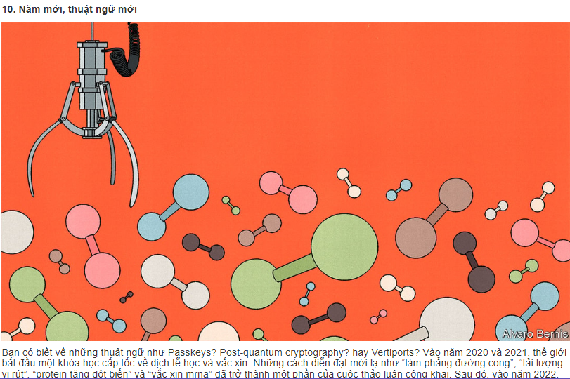 New year, new jargon . Bạn có biết về những thuật ngữ như Passkeys? Post-quantum cryptography? hay Vertiports? Vào năm 2020 và 2021, thế giới bắt đầu một khóa học cấp tốc về dịch tễ học và vắc xin. Những cách diễn đạt mới lạ như “làm phẳng đường cong”, “tải lượng vi rút”, “protein tăng đột biến” và “vắc xin mrna” đã trở thành một phần của cuộc thảo luận công khai. Sau đó, vào năm 2022, cuộc chiến ở Ukraine khiến việc học các thuật ngữ mới trở nên vô cùng cần thiết, chẳng hạn như “himar”. Thuật ngữ nghệ thuật nào sẽ được lưu hành rộng rãi hơn vào năm 2023? sẽ có 23 thuật ngữ với định nghĩa của từng dự đoán để mở rộng vốn từ vựng của độc giả cho năm tới.