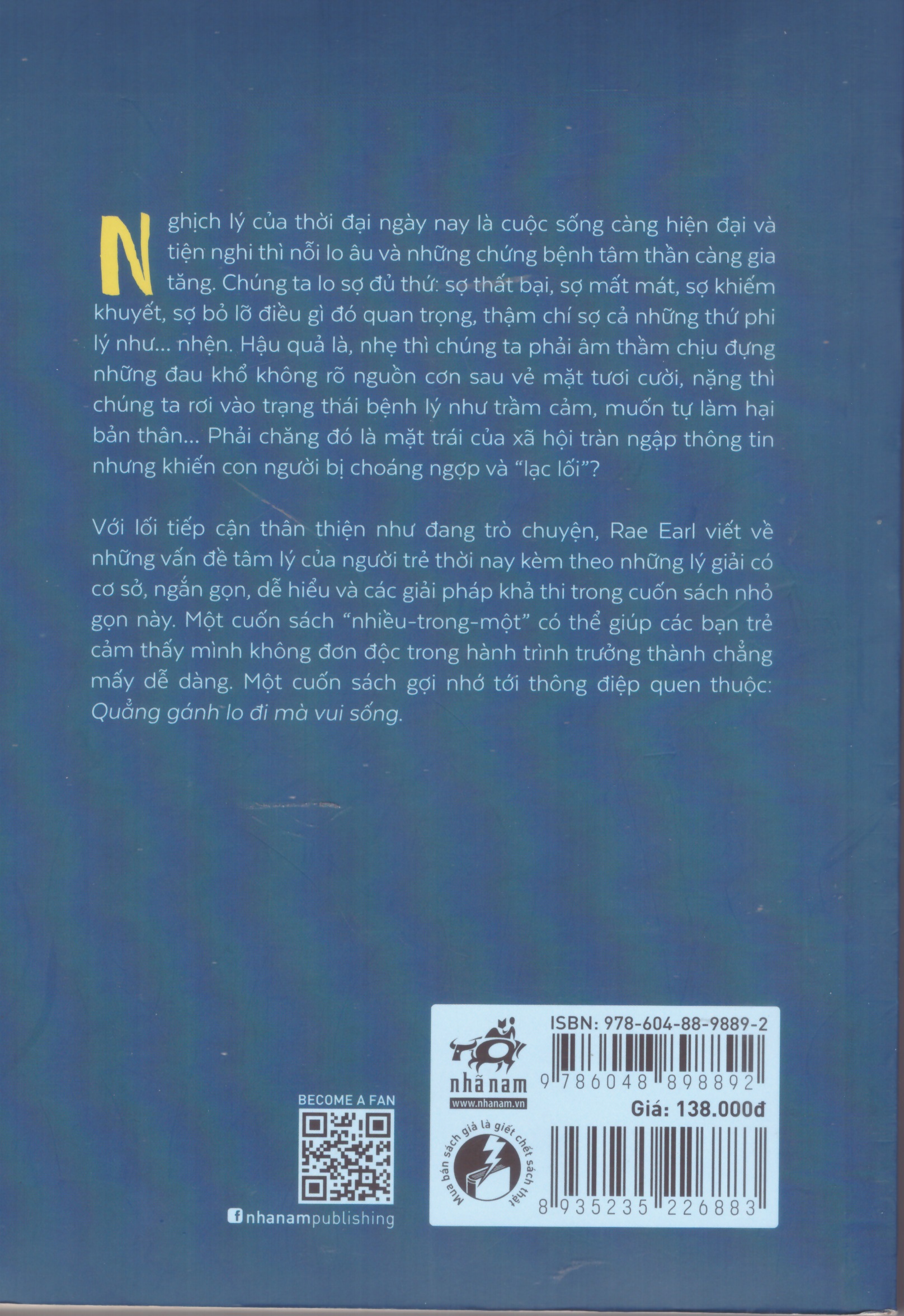 Với lối tiếp cận thân thiện như đang trò chuyện, Rae Earl viết về những vấn đề tâm lý của người trẻ thời nay kèm theo những lý giải có cơ sở, ngắn gọn, dễ hiểu và các giải pháp khả thi trong cuốn sách nhỏ gọn này. Một cuốn sách “nhiều-trong-một” có thể giúp các bạn trẻ cảm thấy mình không đơn độc trong hành trình trưởng thành chẳng mấy dễ dàng. Một cuốn sách gợi nhớ tới thông điệp: Quẳng gánh lo đi mà vui sống.