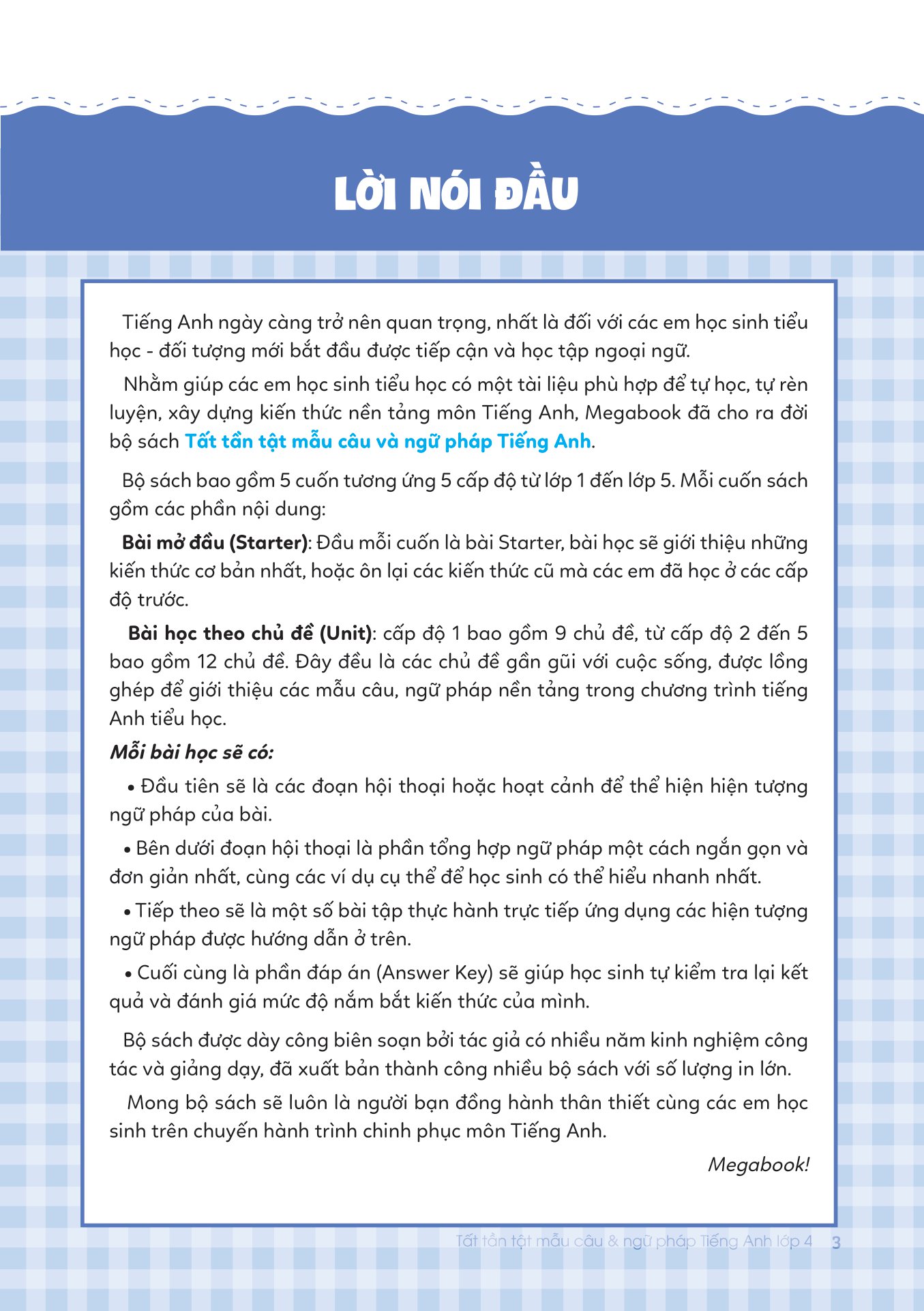 Tiếng Anh ngày càng trở nên quan trọng, nhất là đối với các em học sinh tiểu học - đối tượng mới bắt đầu được tiếp cận và học tập ngoại ngữ. Nhằm giúp các em học sinh tiểu học có một tài liệu phù hợp để tự học, tự rèn luyện, xây dựng kiến thức nền tảng môn Tiếng Anh, bộ sách Tất tần tật mẫu câu và ngữ pháp Tiếng Anh đã ra đời.