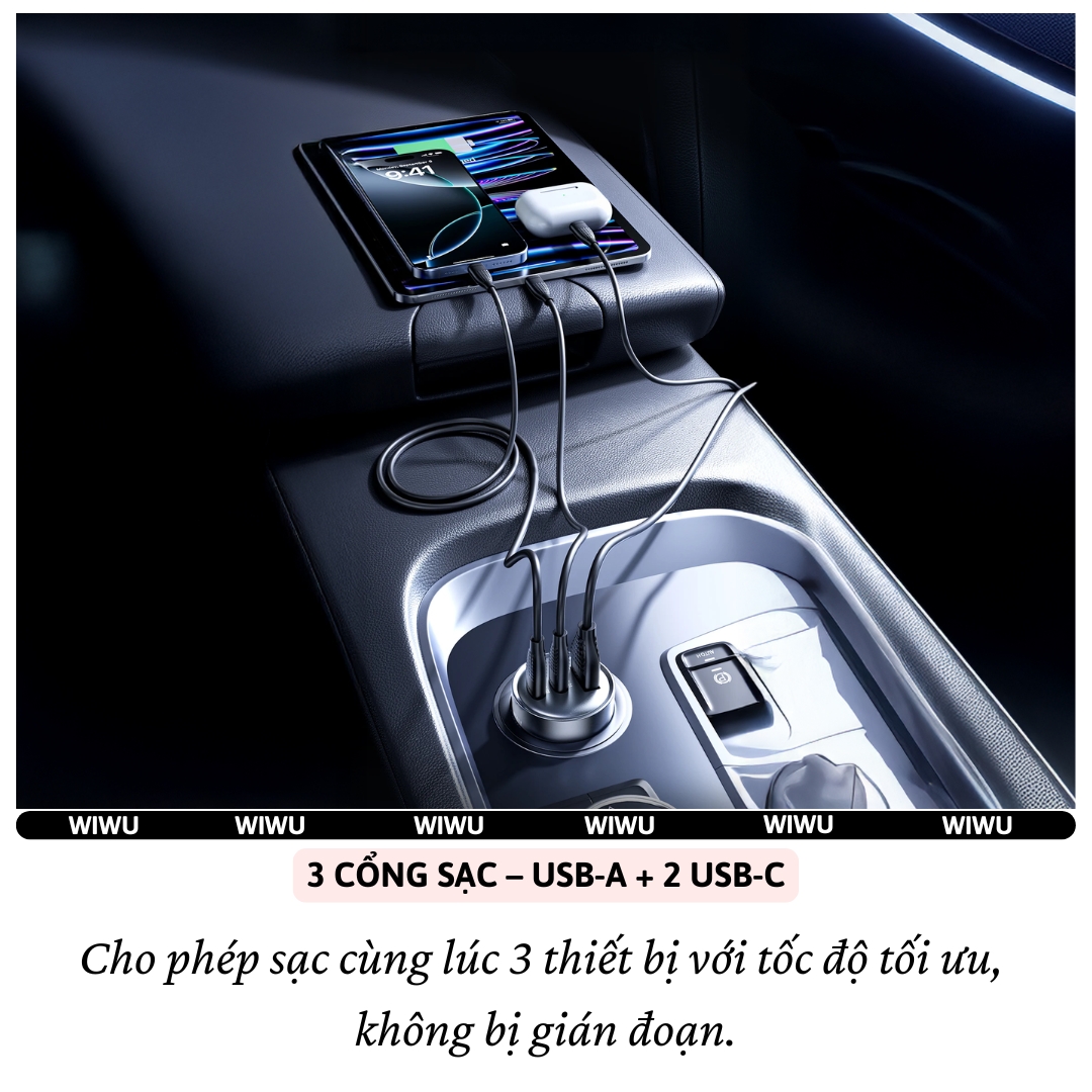 Bộ sạc xe hơi Wiwu 3 In 1 Car Charger Dual USB C + USB A Thương hiệu: Chất liệu: ABS + hợp kim kẽm Đầu vào: DC12-24V Đầu ra (USB): 5V 3A/9V-3A/12V-25A ( Tối