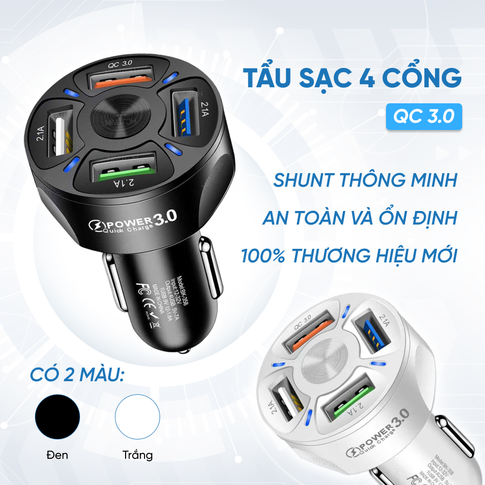 Tẩu Sạc Xe Ô Tô 4 Cổng USB Công Nghệ Sạc Nhanh QC 3.0A THÔNG TIN SẢN PHẨM: - Chất liệu: ABS - Các tính năng: Ổn định điện áp, Cắm và chạy, Chống