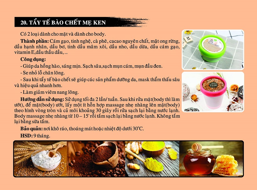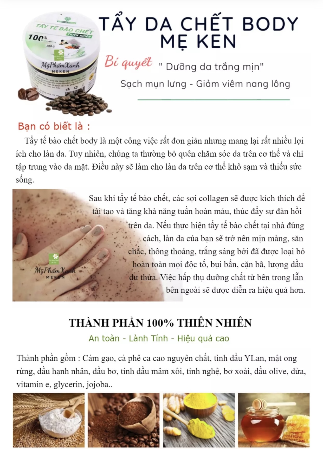 TẨY TẾ BÀO CHẾT BODY MẸ KEN THÀNH PHẦN : cám gạo, tinh nghệ, cà phê, cacao nguyên chất, mật ong rừng, dầu hạnh nhân, dầu bơ, tinh dầu mâm xôi, dầu nho, dầu dừa, dầu cám gạo, vitamin E,dầu thầu dầu, … CÔNG DỤNG :