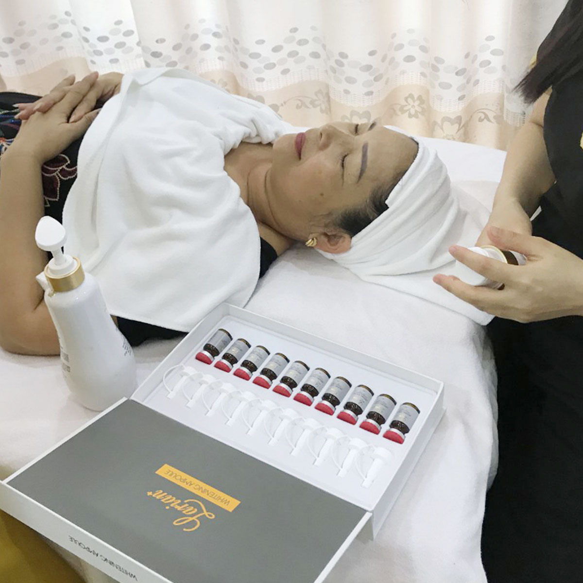 Đặc điểm sản phẩm: Whitening ampoule giúp ức chế sản xuất melanin, loại bỏ thâm nám, tàn nhang. Cung cấp các dưỡng chất làm trắng sáng da, đồng đều màu da. Tái tạo, phục hồi da bị tổn thương, da bị tăng sắc tố do sử dụng các loại mỹ phẩm nhiễm coticoir, do lăn kim, phi kim, laser…. Whitening ampoule cung cấp các axit amin cần thiết giúp kích thích sản sinh các tế bào da mới cho làn da khỏe mạnh và loại bỏ hiệu quả tình trạng nám, tàn nhang, các đốm đen, vết chân chim, các vùng da không đều màu, nuôi dưỡng da trắng sáng từ sâu bên trong. Sử dụng thường xuyên giúp bổ sung độ ẩm cho da, tạo lớp hàng rào bảo vệ giúp da tránh khỏi tình trạng mất nước, thô ráp, bong tróc, se khít lỗ chân lông, tăng cường độ đàn hồi cũng như xóa mờ các nếp nhăn…