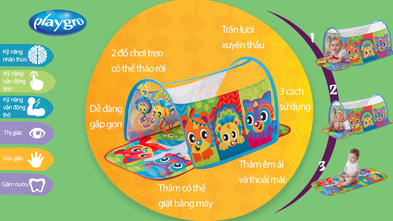 • Đây là một tấm thảm tuyệt vời – kích thích phát triển 4 giác quan: thị giác, thính giác, xúc giác và khả năng tập trung của trẻ ngay từ khi mới sinh •