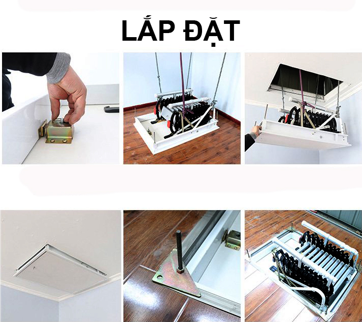 Tháo rời phần bậc thang với phần khung thang ra Bắt 4 con ốc theo thang ở 4 góc khung thang đã được khoan lỗ sẵn Kéo phần khung thang lên ốp lọt vào trong lỗ chờ, sau đó thả bát tam giác kèm theo thang vào 4 con ốc siết ốc phía trên bát, để cố định khung thang lại. Thả cửa khung thang suống, kéo phần đầu bậc thang lên, gắn ốc cố định bậc thang vào khung thang như cũ.