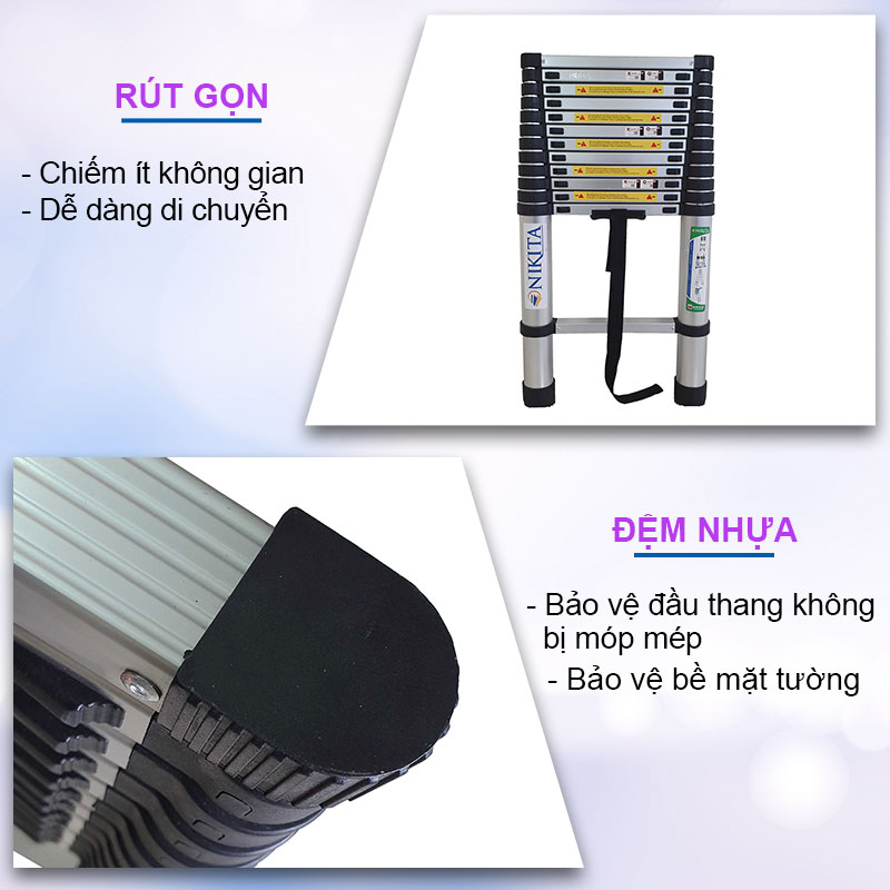 Thang nhôm rút gọn, an toàn, tiện dụng, đa năng - Nhôm 6063 không rỉ - Hàng chính hãng NIKITA Chất liệu : Nhôm + Plastic Màu sắc : Ống trắng + Đai nhựa