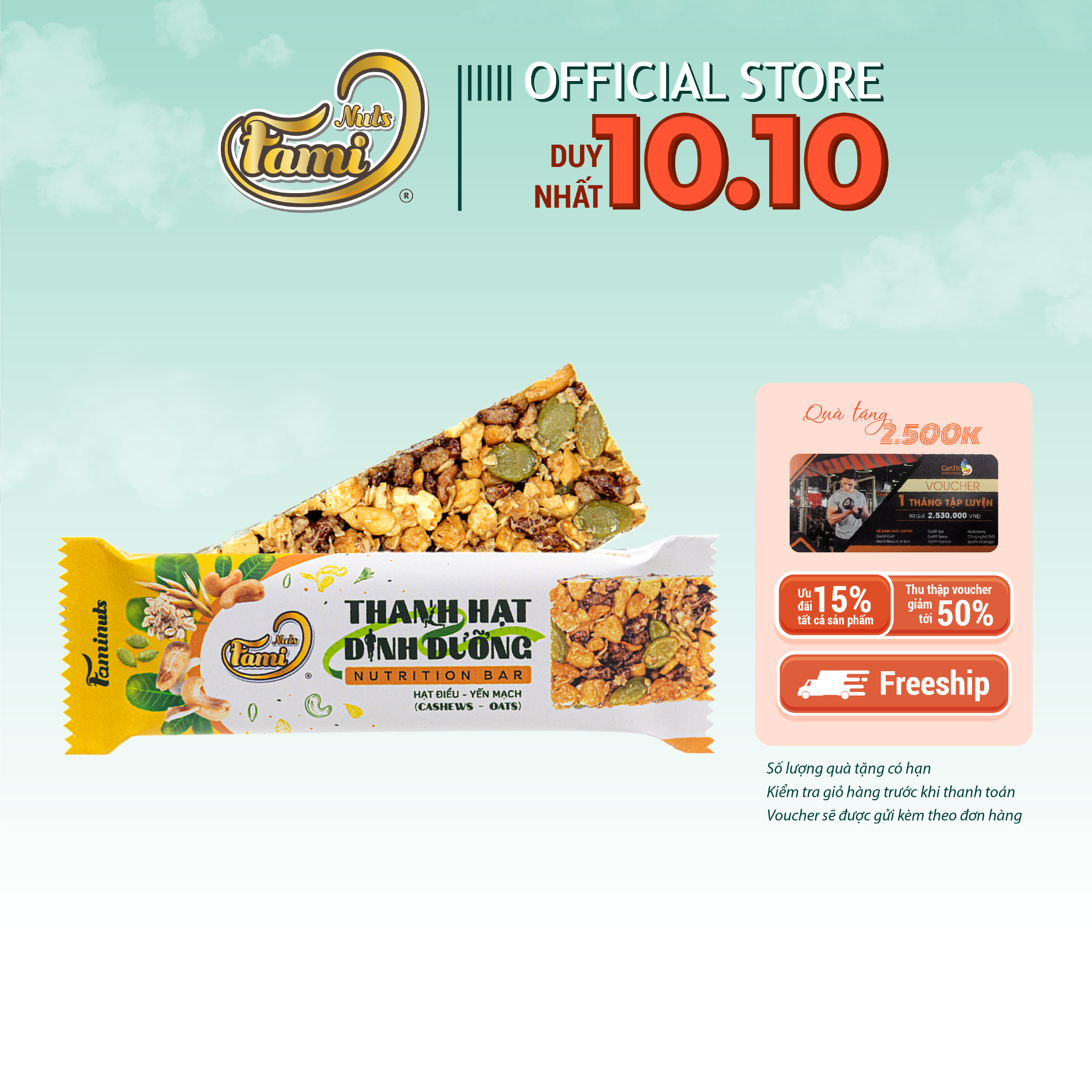 Mua tại TiktokTHÔNG TIN SẢN PHẨM THANH HẠT DINH DƯỠNG VỊ HẠT ĐIỀU & YẾN MẠCH FAMINUTS Thanh hạt dinh dưỡng ít calo - bữa ăn sáng tiện lợi Đa dạng sự lựa chọn với nhiều hương vị Thành phần: Kết hợp nhiều loại hạt dinh dưỡng