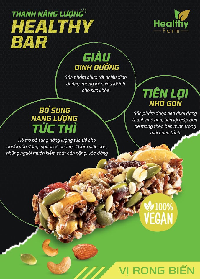 Thanh năng lượng Healthy Bar là thực phẩm bổ sung năng lượng tức thì cho những người vận động cao, người có cường độ làm việc cao không có thời gian ăn uống hay những người muốn kiểm soát cân nặng, vóc dáng.