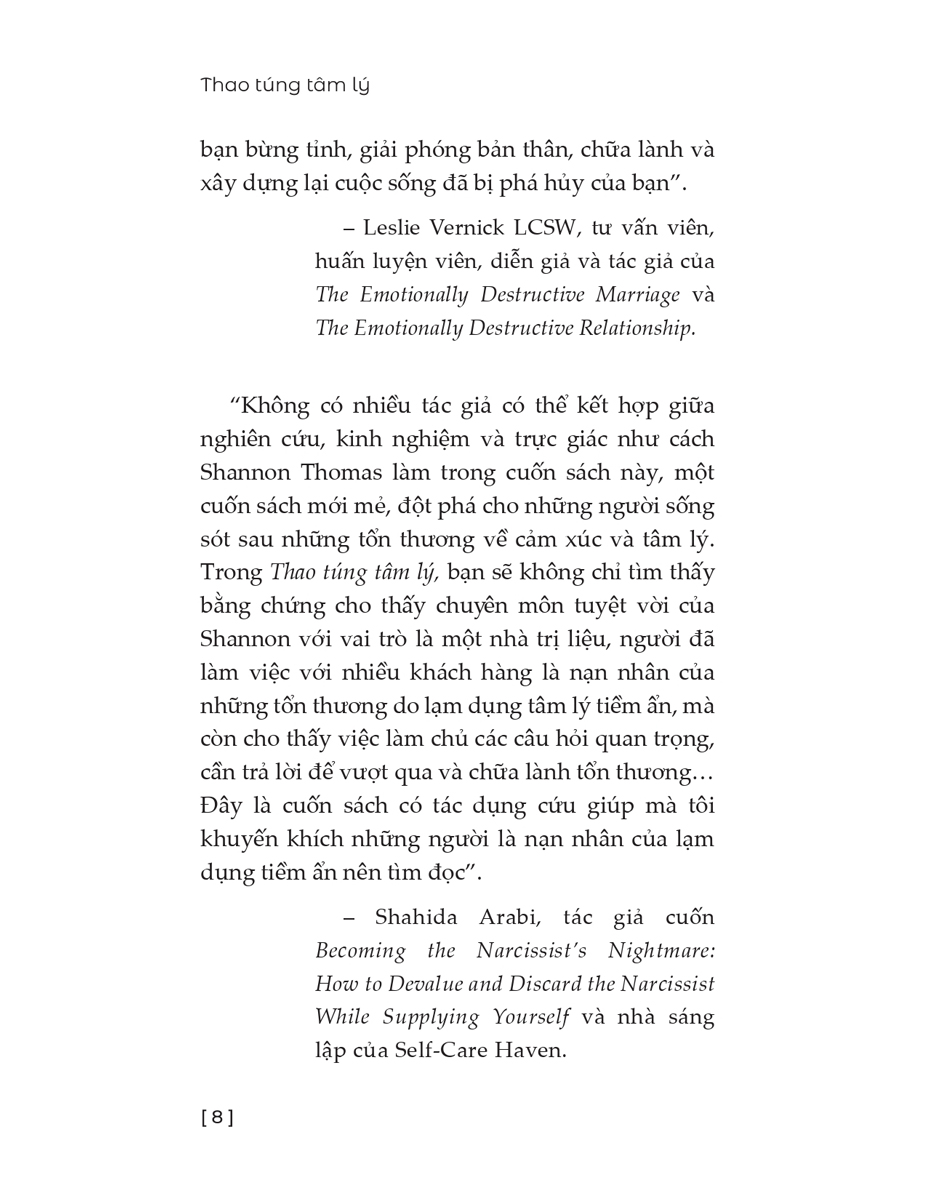 Shannon Thomas giới thiệu những kiến thức cơ bản về đặc điểm, các dạng của lạm dụng tâm lý nói chung, thao túng tâm lý nói riêng, và cung cấp cho người đọc hành trình chữa lành gồm 6 giai đoạn:
