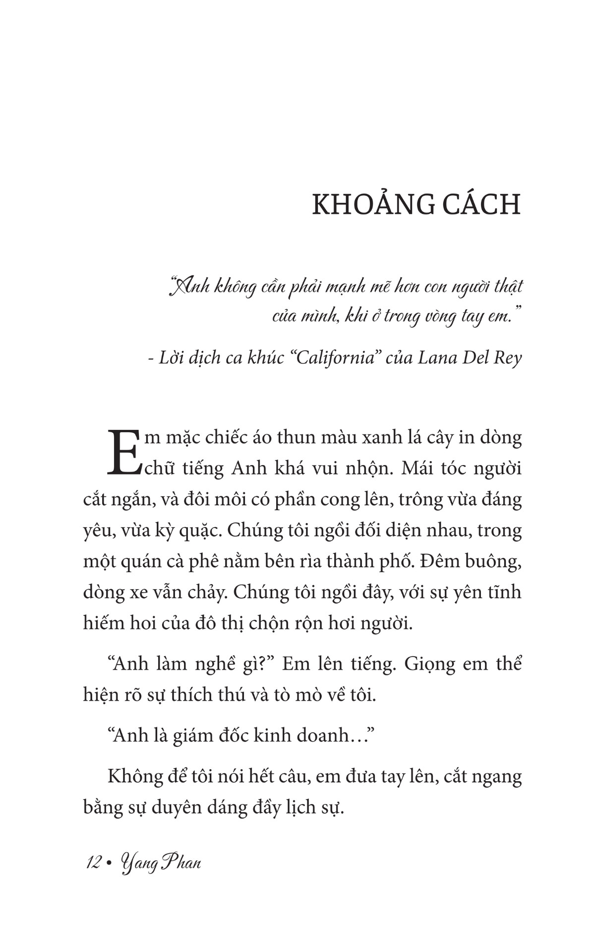Trong truyện của Yang Phan, có cô gái sẵn sàng trải nghiệm cuộc sống của người mình yêu, để hiểu nhau hơn, để có thể đứng dưới góc nhìn của người kia mà thấu cảm, mà cư xử. Có chàng trai vượt qua mọi định kiến về tuổi tác, sự ngăn cản của gia đình đến cuối cùng vẫn nắm chặt tay người mình thương. Có tình đầu trong veo, chân thành, non nớt thuở mới bắt đầu tập yêu. Cũng có tình yêu tri kỷ, chỉ cần ở cạnh bên nhau phút cuối cuộc đời vẫn có thể sưởi ấm trái tim lạnh giá nhất…
