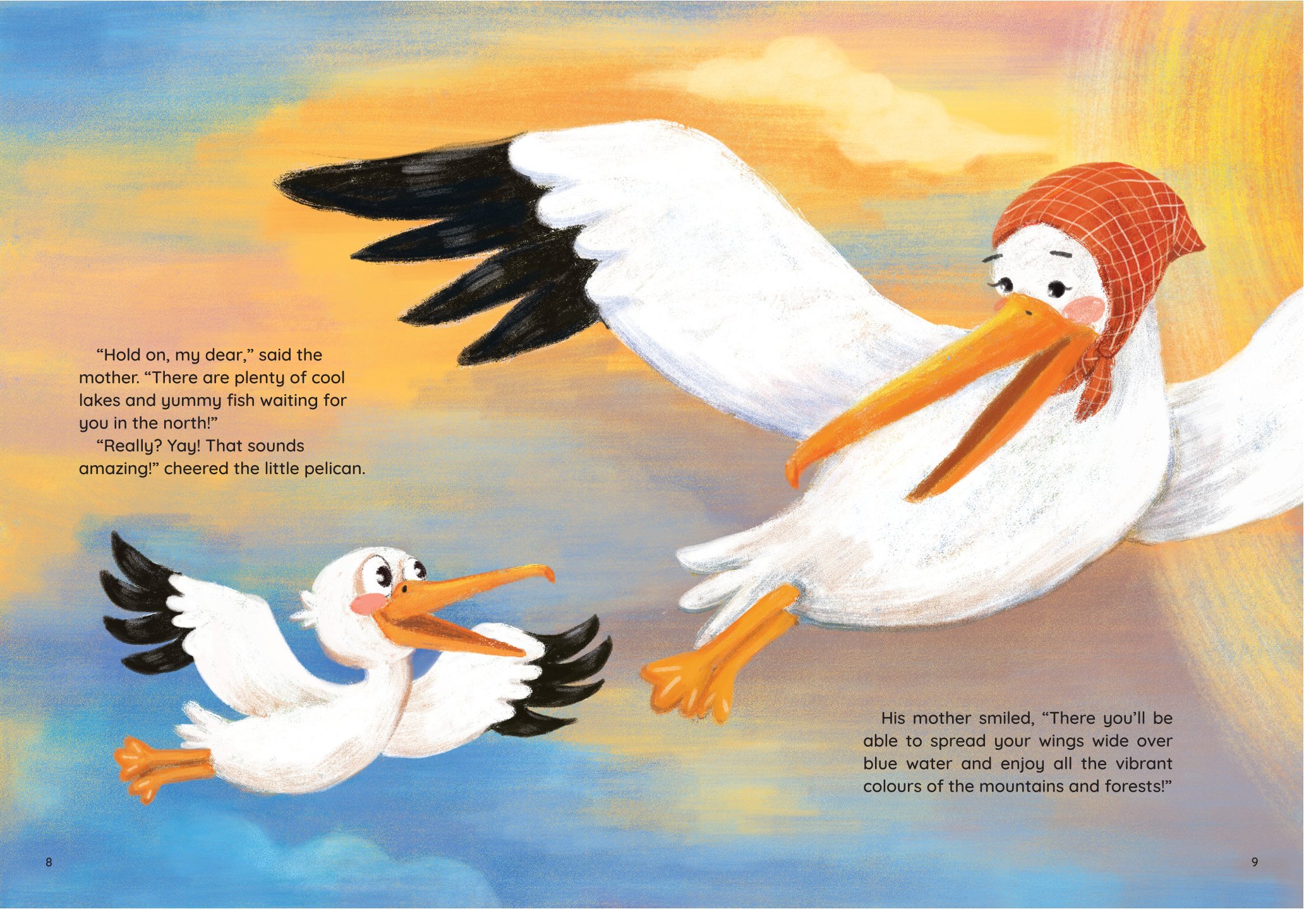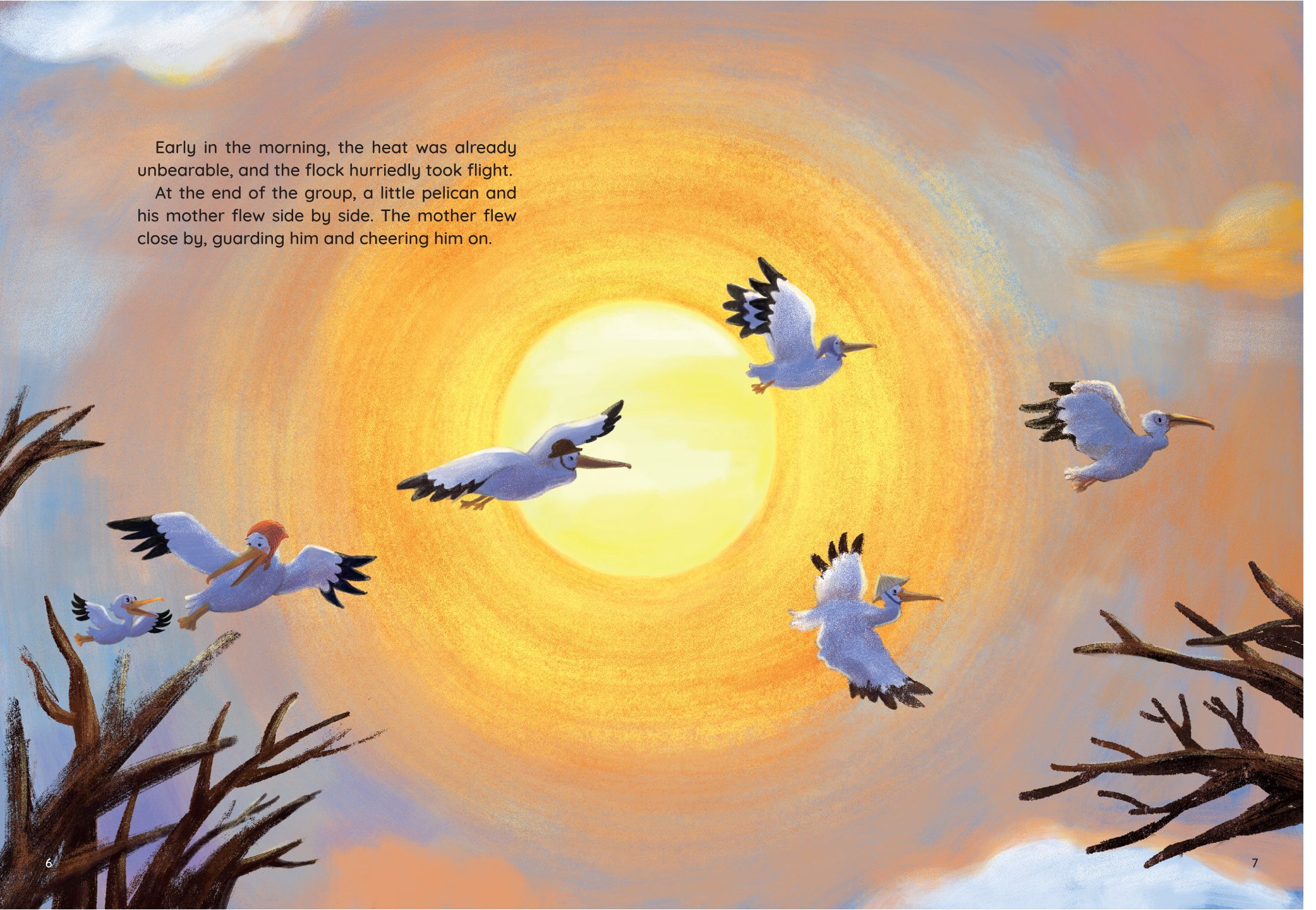 Long ago, during a drought, a flock of pelicans flew together from the south to the north. Among them, there were a mother pelican and her little one. They always stayed close during this long and dangerous journey. But when the mother got hurt, what could her child do?