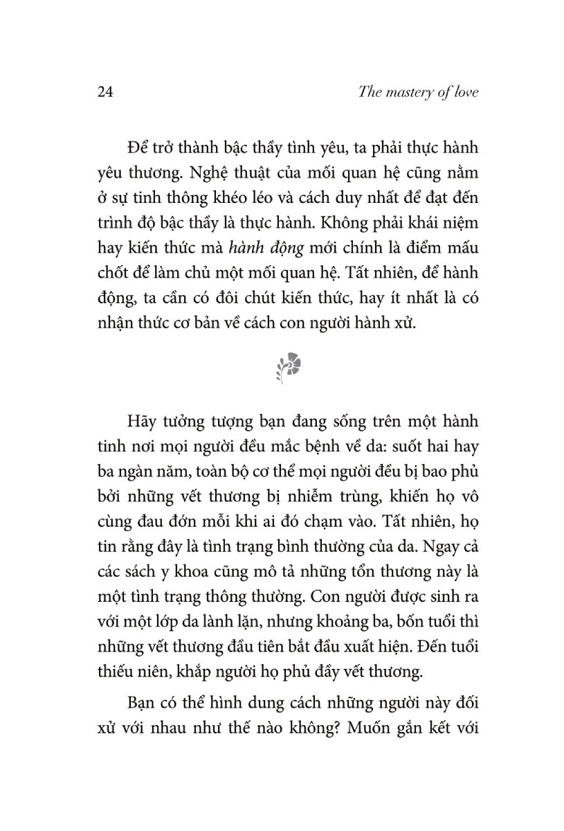 Để trở thành bậc thầy tình yêu, ta phải thực hành yêu thương. Nghệ thuật của mối quan hệ cũng nằm ở sự tinh thông khéo léo và cách duy nhất để đạt đến trình độ bậc thầy là thực hành. Không phải khái niệm hay kiến thức mà hành động mới chính là điểm mấu chốt để làm chủ một mối quan hệ. Tất nhiên, để hành động, ta cần có đôi chút kiến thức, hay ít nhất là có nhận thức cơ bản về cách con người hành xử.