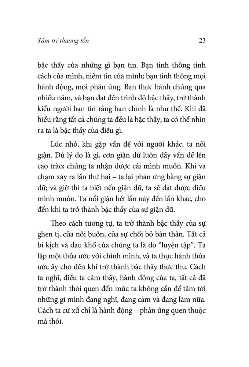 Tất cả bi kịch và đau khổ của chúng ta là do “luyện tập”. Ta lập một thỏa ước với chính mình, và ta thực hành thỏa ước ấy cho đến khi trở thành bậc thầy thực thụ. Cách ta nghĩ, điều ta cảm thấy, hành động của ta, tất cả đã trở thành thói quen đến mức ta không cần để tâm tới những gì mình đang nghĩ, đang cảm và đang làm nữa. Cách ta cư xử chỉ là hành động – phản ứng quen thuộc mà thôi.
