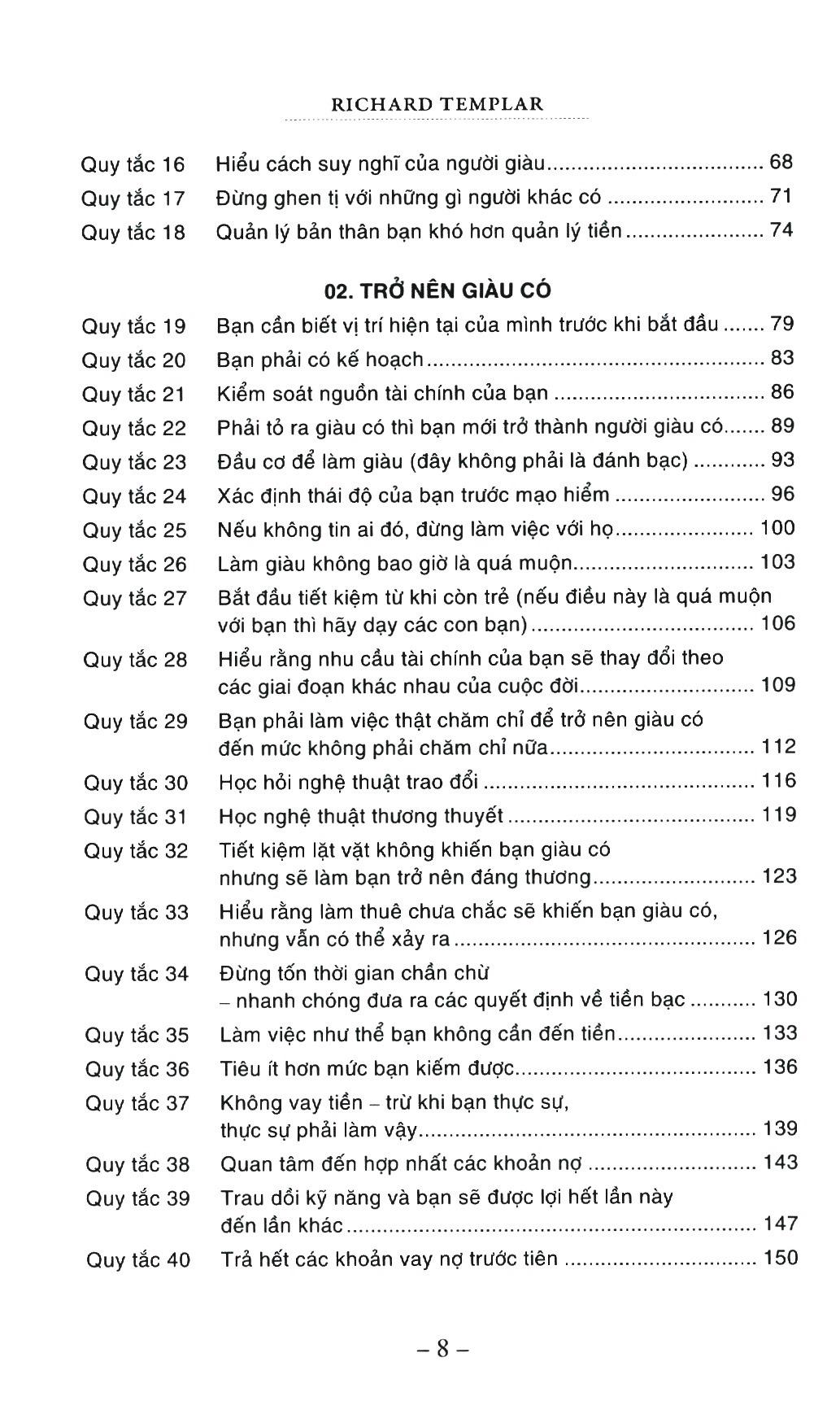 The Rule Of Wealth - Những Quy Tắc Để Giàu Có Tiền bạc và sự giàu có dường như có ma lực vô hình hấp dẫn chúng ta. Có lẽ ai cũng từng một lần mơ ước thành tỷ phú. Trở thành "kiến trúc sư trưởng" của Microsoft như Bill Gates, sở hữu những bất động sản trị giá hàng tỷ đô la như Donald Trump hay thu được khoản lợi nhuận khổng lồ từ đầu tư chứng khoán như Warren Buffett… là giấc mơ của hầu hết mọi người. Nhưng làm thế nào để biến khát khao thành hành động, biến ước mơ thành hiện thực? Đã có hàng trăm cuốn sách dạy làm giàu, những chương trình hướng dẫn làm kinh tế, song, áp dụng chúng thế nào và có thành công hay không lại phụ thuộc vào chính bạn. Bởi tiền bạc không tự tìm đến bạn và con đường làm giàu cũng đầy chông gai. Giống như khi đi tìm kho báu, để khởi đầu hành trình đến đích giàu có, bạn cũng cần một tấm bản đồ chi tiết, chính xác. Những quy tắc để giàu có của tác giả Richard Templar chính là tấm bản đồ như thế. Trong cuốn sách này, Richard Templar sẽ dẫn dắt các bạn bắt đầu với suy nghĩ Giàu có để trở nên giàu có và giàu có hơn nữa rồi chia sẻ giàu có. Những quy tắc thiết thực, hữu ích, được đúc kết từ kinh nghiệm của rất nhiều người mà tác giả đưa ra sẽ giúp bạn ngày càng tiến gần đến đích. Hãy đọc, nghiền ngẫm kỹ từng quy tắc, và quan trọng nhất là hãy áp dụng chúng, bạn sẽ thấy điều kì diệu xảy ra.