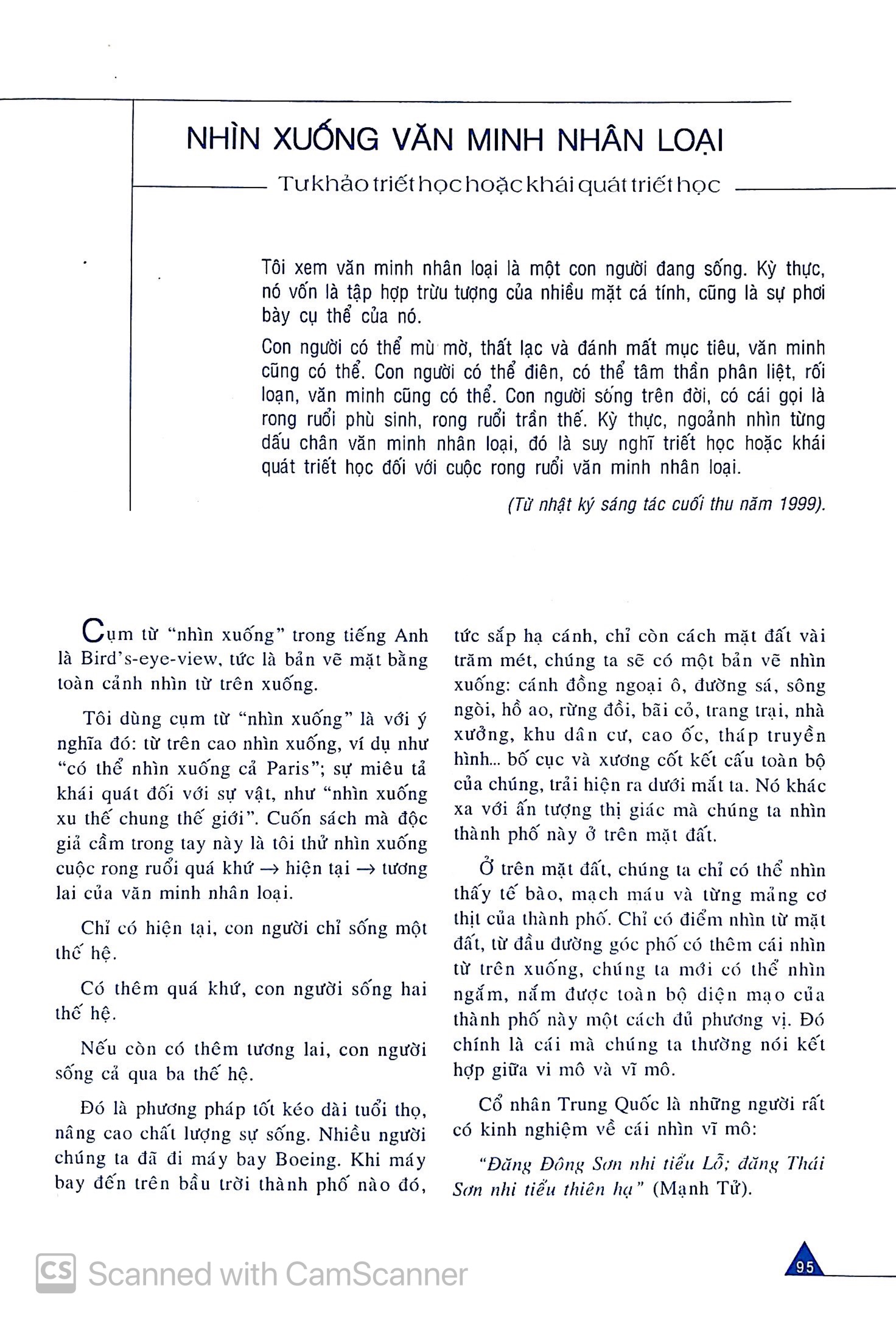 Cuốn sách “Theo dòng văn minh nhân loại”(*) thâm nhập vào hai thế giới mà tác giả gọi là “cái sự thực cứng” và “cái nguyên lý mềm”. Tức, hai mặt để thúc đẩy văn minh nhân loại là: văn khoa (khoa học xã hội nhân văn) và lý công khoa (khoa học tự nhiên công nghệ). Điểm đặc biệt (hấp dẫn) của cuốn sách là tác giả không “làm” lịch sử văn minh nhân loại mà cùng đi, cùng nhìn, cùng xới lật, cùng thẩm thấu… tiến trình phát triển của văn minh nhân loại.