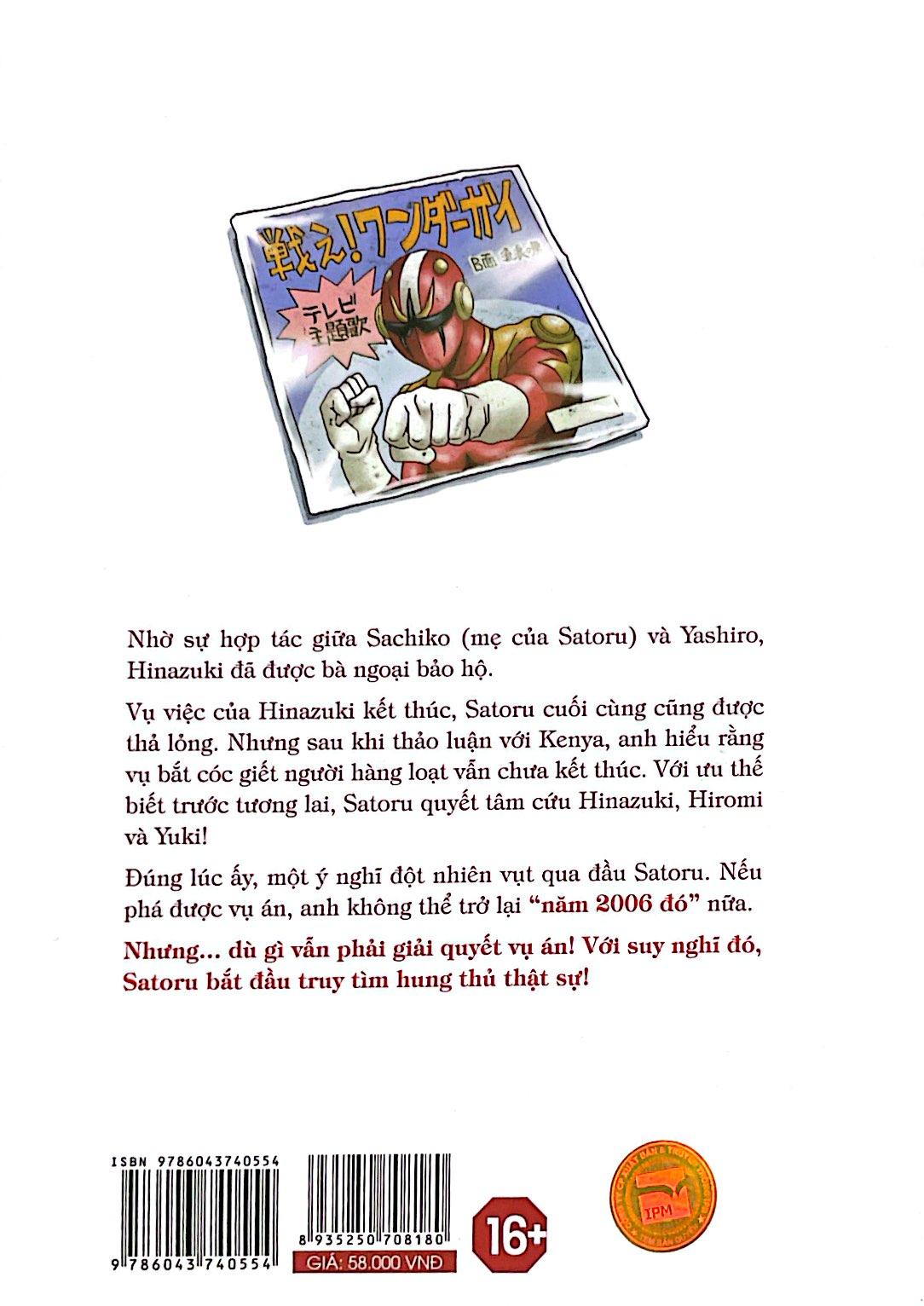 Nhờ có sự trợ giúp từ thầy Yashiro và mẹ của mình, Satoru đã giải thoát Hinazuki khỏi số phận chết chóc. Lịch sử mới dần hình thành và thay thế cho dòng lịch sử cũ, “năm 2006” mà Satoru biết đã không còn. Tuy nhiên, anh không có thời gian để bận tâm đến chuyện ấy. Việc cần làm lúc này là phải giải quyết triệt để vụ bắt cóc, giết người hàng loạt. Khi trong tay không còn manh mối nào khác, liệu Satoru có thể tìm ra tên hung thủ thật sự đang lẩn trốn trong thị trấn không? Hãy cùng đón đọc tập 5 của Thị trấn vắng mình tôi.