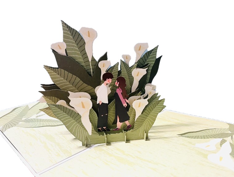 Thể hiện tình cảm ngọt ngào bằng thiệp 3D Pop Up cặp đôi giữa vườn hoa loa kèn. Khi mở thiệp, hình ảnh đôi tình nhân bật nổi giữa những bông loa kèn trắng tinh