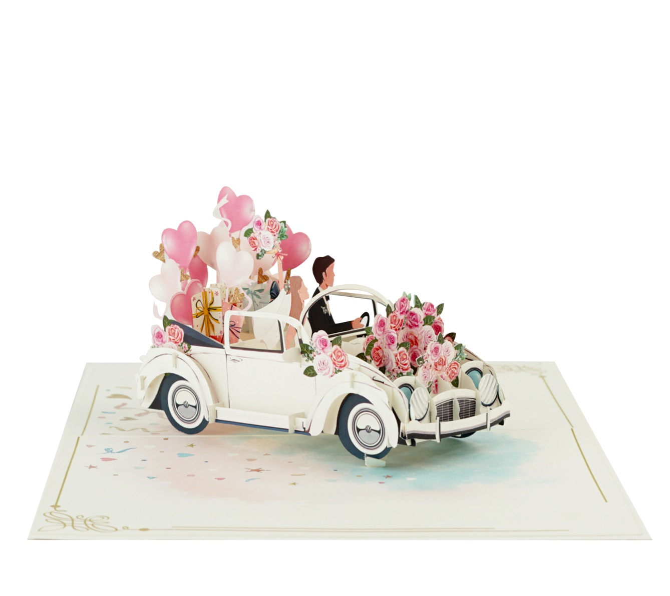 Tạo bất ngờ cho ngày trọng đại với thiệp 3D Pop Up xe cưới Just Married. Khi mở ra, chiếc xe cưới màu đỏ nổi bật bật lên đầy sống động, trang trí hoa tươi