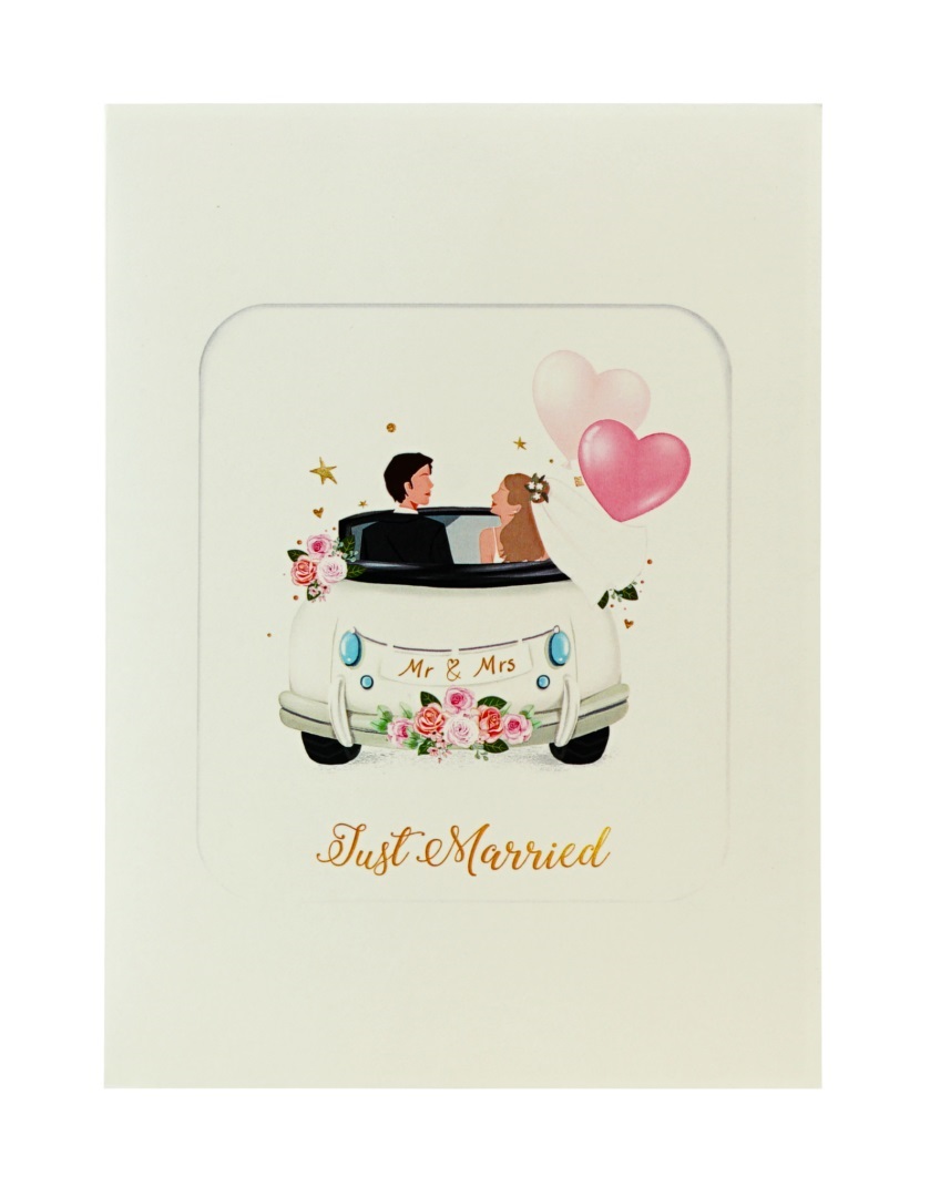 Tạo dấu ấn đặc biệt với thiệp 3D Pop Up xe cưới cổ điển Just Married. Khi mở ra, hình ảnh chiếc xe cưới sang trọng bật nổi, trang trí hoa tươi rực rỡ, kèm