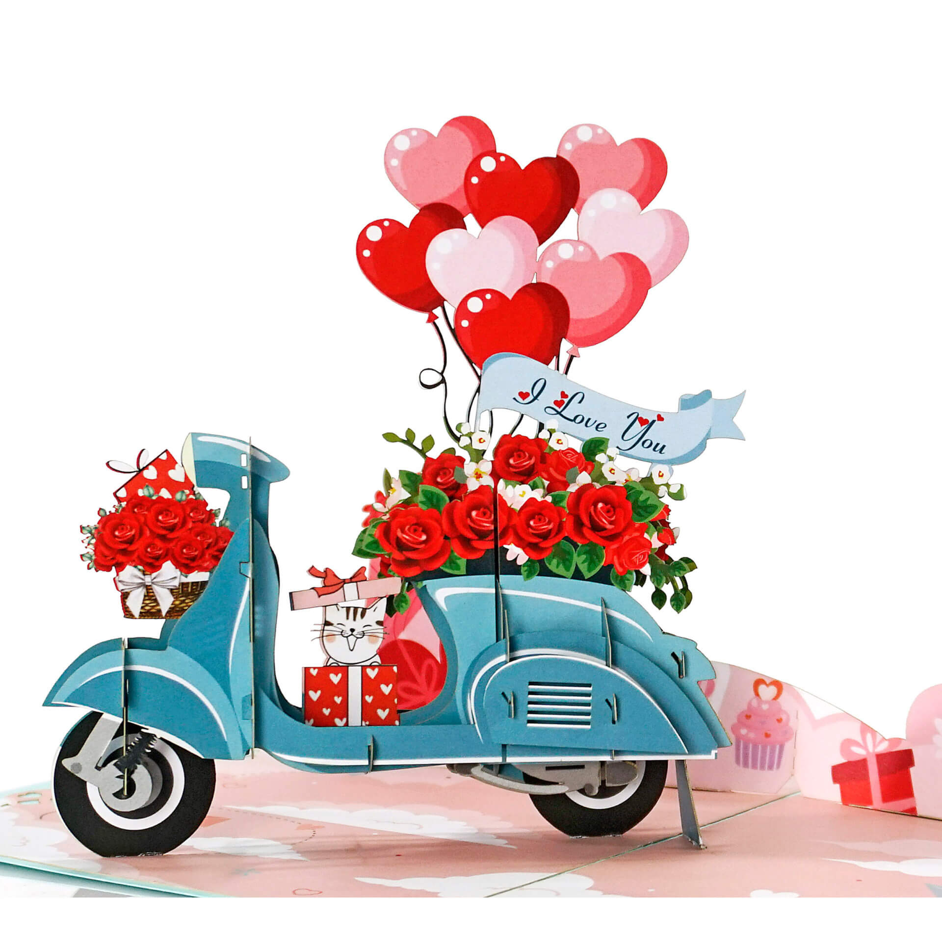Thay lời muốn nói bằng thiệp 3D Pop Up xe máy tình yêu độc đáo. Khi mở ra, hình ảnh chiếc xe máy xanh bật nổi, chở đầy hoa hồng đỏ, bóng bay trái tim