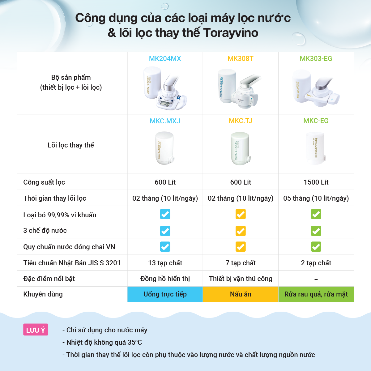 - Không cần sử dụng điện và gắn trực tiếp tại vòi giúp tiết kiệm không gian sử dụng. Với việc loại bỏ 7 tạp chất trong nước và đến 99 % vi khuẩn gây hại Torayvino MK308T phù hợp với việc nấu ăn trong gia đình. 7 loại tạp chất bao gồm: 1.Dư lượng Chlorine (loại bỏ 80%) 2.Độ đục (tốc độ dòng chảy 50%) 3.Trihalomethanes tổng (TTHM) (loại bỏ 80%) 4.2-MIB (nấm mốc) (loại bỏ 80%) 5.CAT (hóa chất công nghiệp) (loại bỏ 80%) 6.Nhóm Tetrachloroethylene (loại bỏ 80%) 7.Nhóm Trichloroethylene (loại bỏ 80%) Lưu ý: