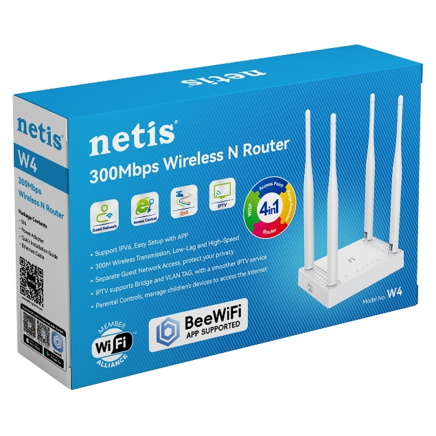 MÔ TẢ SẢN PHẨM ̣̂ ́   ̂̉  Đ ̂́ Đ̣̂      ̂̉  ̉ ̂̉ W4 Bộ định tuyến không dây đa chế độ 300Mbps - Tốc độ không dây cao đáng kinh ngạc lên đến 300Mbps, tuyệt vời cho việc tải xuống nhanh hơn, gọi Internet, phát video HD và IPTV - Được trang bị 4 ăng-ten thu sóng cao 5dBi, 1 cổng WAN nhanh + 2 cổng LAN nhanh - Bộ xử lý hiệu suất cao 1GHz vượt trội với RAM 64MB và Bộ nhớ Flash 8MB tối ưu hóa hiệu suất mạng của bạn - 4 chế độ đa năng trong 1: hỗ trợ Chế độ bộ định tuyến, Chế độ điểm truy cập, Chế độ mở rộng phạm vi và Chế độ WISP. - Hỗ trợ mạng khách, bảo vệ mạng riêng của bạn tốt hơn - Thiết lập dễ dàng trong vài phút giúp tiết kiệm thời gian và công sức của bạn - Quản lý APP BeeWiFi, linh hoạt và tiện lợi - Kiểm soát băng thông thông minh và Kiểm soát truy cập Internet  ̂ ̂́ ̃ ̣̂ - Tiêu chuẩn IEEE802.11b, IEEE802.11g, IEEE802.11n - Tốc độ tín hiệu: Lên đến 300Mbps - Dải tần số: 2,4-2,4835GHz - Truyền tải điện năng: 20 dBm (TỐI ĐA) - Chế độ làm việc: Bộ định tuyến, WISP, Điểm truy cập, Bộ mở rộng phạm vi - Giao diện: + 1  Cổng WAN RJ45 MDI/MDIX tự động 10/100Mbps + 2  Cổng LAN RJ45 MDI/MDIX tự động 10/100Mbps - Ăng-ten: cố định 4  5dBi - Cổng: PWR,WLAN,LAN1-LAN4,WAN,WPS - Nút: WPS/ RESET - Điện áp: DC 12V/0.5A(Đầu ra) - Hộp sản phẩm bao gồm: + 1  thiết bị + 1  Bộ đổi nguồn 12V/0.5A + 1  Hướng dẫn cài đặt nhanh (Nhiều ngôn ngữ)