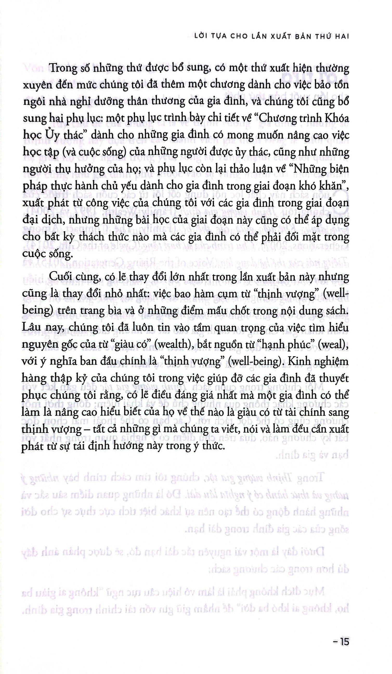 Thịnh Vượng Gia Tộc (Bìa mềm) Thịnh vượng gia tộc giúp chúng ta phát triển, duy trì và quản lý tài sản qua các thế hệ. Cuốn sách là tập hợp những hướng dẫn được cập nhật và mở rộng để thay đổi cách bạn nghĩ về sự giàu có và di sản của m.ình. Cuốn sách còn cung cấp câu trả lời bạn cần cùng với hướng dẫn và chiến lược để giữ nguyên khối tài sản của gia đình bạn. Thịnh vượng gia tộc cung cấp tư duy mới nhất về thịnh vượng, những ý tưởng và thực hành có ý nghĩa lâu dài để các gia đình duy trì, phát triển và quản lí tài sản qua các thế hệ. Cuốn sách là tập hợp những hướng dẫn được cập nhật và mở rộng để thay đổi cách chúng ta nghĩ về thịnh vượng và di sản của m.ình. Thịnh vượng đích thực vượt lên trên tiền bạc đơn thuần, bao gồm 6 loại gia sản: