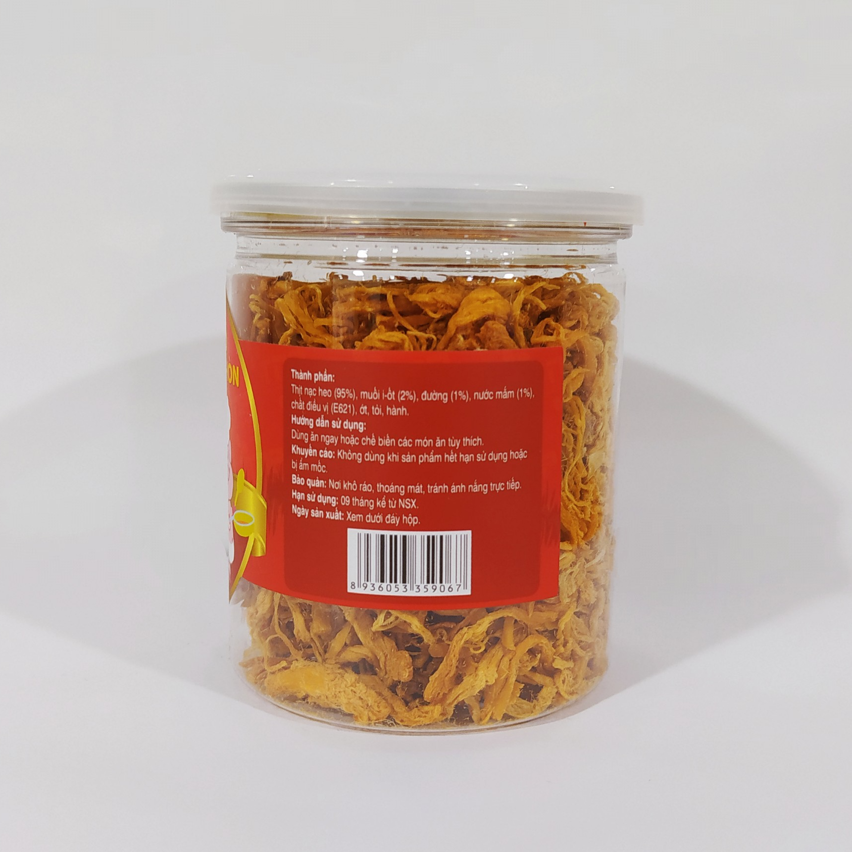 Mua tại TiktokTHỊT HEO SẤY GIÒN CHÀ CHÀ Thành phần: Thịt nạc heo (95%), muối (2%), đường (1%), nước mắm (1%), chất điều vị mononatri glutamat (621) (1%). Chỉ tiêu chất lượng chủ yều: Độ ẩm ≤ 14% khối lượng, Protein ≥ 37% khối lượng. Thịt heo đã được kiểm dịch và vệ sinh ATTP. Hướng dẫn sử dụng: Có thể ăn ngay khi mở bao bì Hướng dẫn bảo quản: Bảo quản nơi khô ráo, thoáng mát, tránh ánh nắng mặt trời.