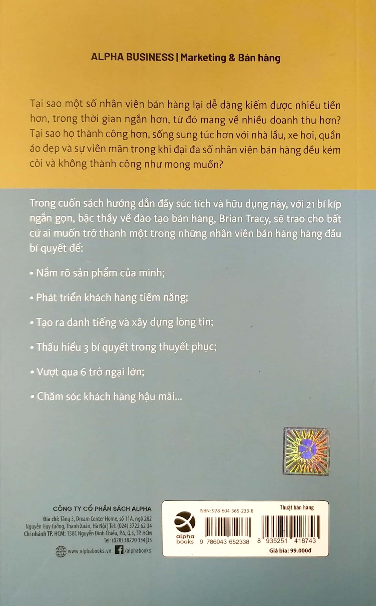 Thuật Bán Hàng của Brian Tracy sẽ là cuốn sách hướng dẫn đầy súc tích và hữu dụng này, bậc thầy về đào tạo bán hàng, Brian Tracy, sẽ trao cho bất cứ ai muốn thành công trong lĩnh vực kinh doanh bí quyết để giành chiến thắng.