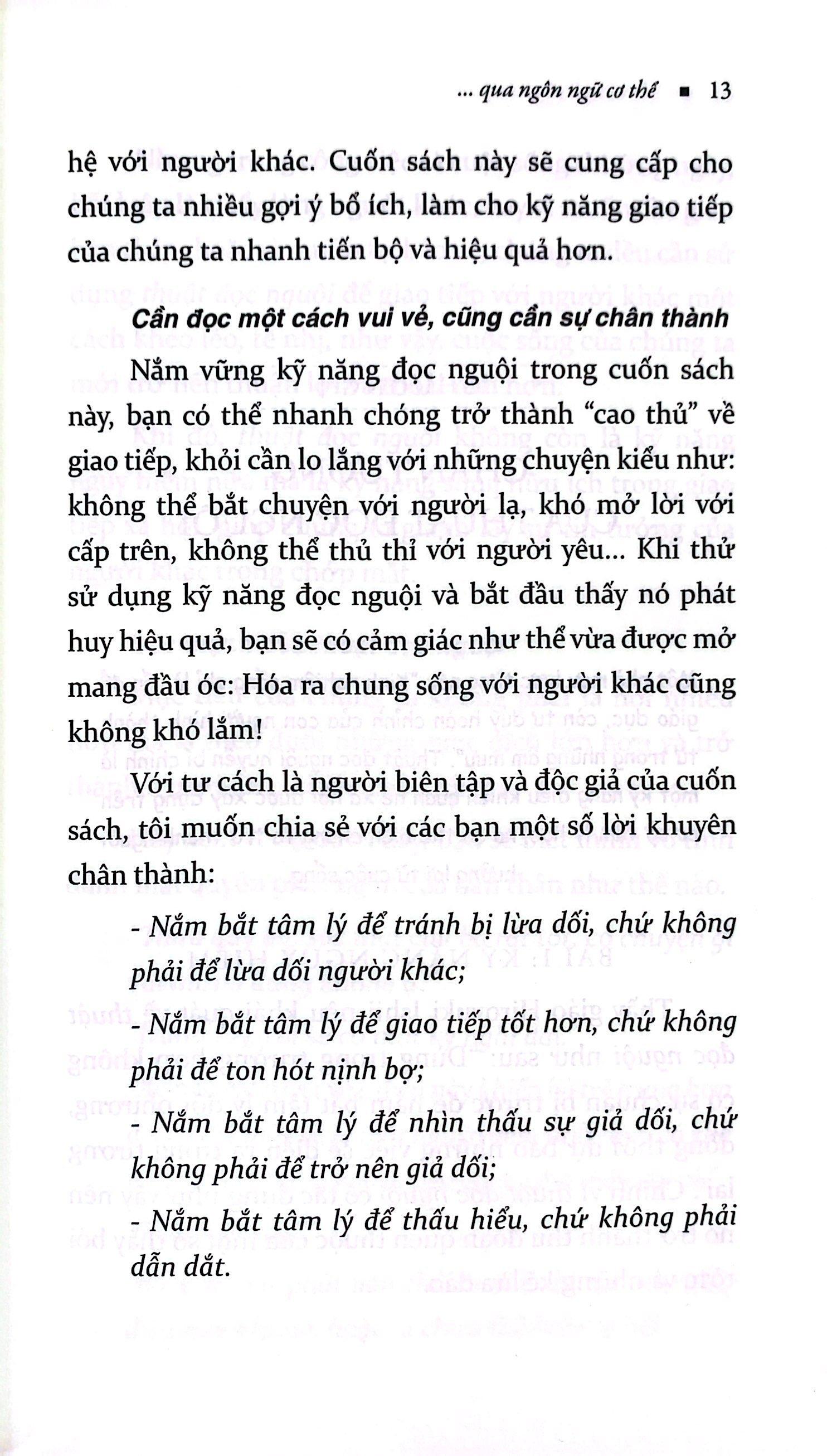 Với mục đích học để ứng dụng, dựa trên những kết quả nghiên cứu ứng dụng tâm lý học trong một thời gian dài, tác giả trình bày và giải thích về thuật đọc nguội một cách hệ thống. Sau khi tổng hợp tối đa các kiến thức chuyên ngành như: tâm lý học, ngôn ngữ học, marketing… tác giả đã chỉnh lý, bổ sung và kết cấu thành hệ thống về kỹ năng này từ những ứng dụng của nó trong cuộc sống hàng ngày như: làm sao để nhanh chóng có được sự tin tưởng của đối phương, hay làm thế nào để khởi đầu giao tiếp một cách thuận lợi, tìm hiểu và nắm bắt tâm lý của người hướng nội hay hướng ngoại… Trong chương cuối cùng của cuốn sách, tác giả tuyển chọn ra chin loại hình ngôn ngữ đọc nguội quan trọng nhất trong giao tiếp xã hội. Khi đã nắm vững kỹ năng, vận dụng thành thục thuật đọc nguội để hiểu thấu và điều khiển suy nghĩ của đối phương, bạn sẽ chiếm được cảm tình của rất nhiều người, các mối quan hệ xã hội của bạn cũng từ đó sẽ ngày càng được mở rộng.