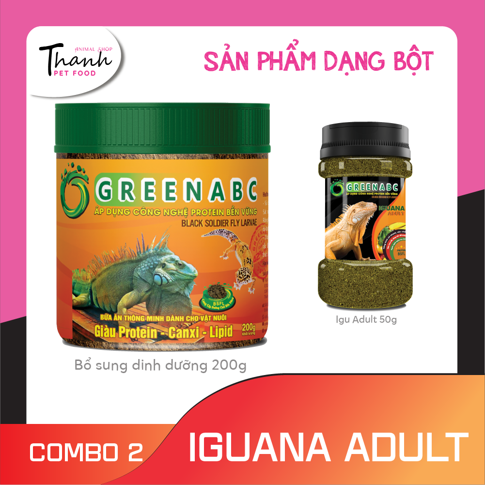 GREENABC là thức ăn cao cấp dành cho Iguana Trưởng Thành - Rồng Nam Mỹ Trưởng Thành. Đặc biệt sản phẩm GREENABC được sản xuất theo phương pháp Áp dụng công nghệ PROTEIN bền vững từ bột đạm G.Meal rất giàu PROTEIN – CANXI – LIPID có trong BSFL, đã được Mỹ (AAFCO) và EU chấp nhận đưa vào công thức cho ngành sản xuất thức ăn dành cho vật nuôi.