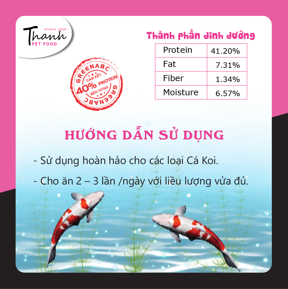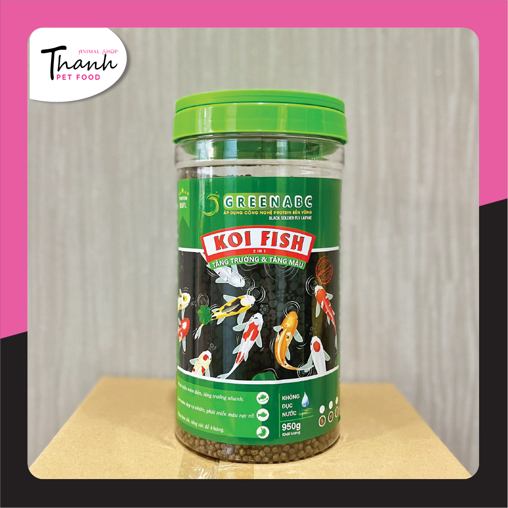 GREENABC - THỨC ĂN CÁ KOI - HÀM LƯỢNG PROTEIN > 40% GREENABC là thức ăn cao cấp dành cho CÁ KOI. Đặc biệt sản phẩm GREENABC được sản xuất theo phương pháp Áp dụng