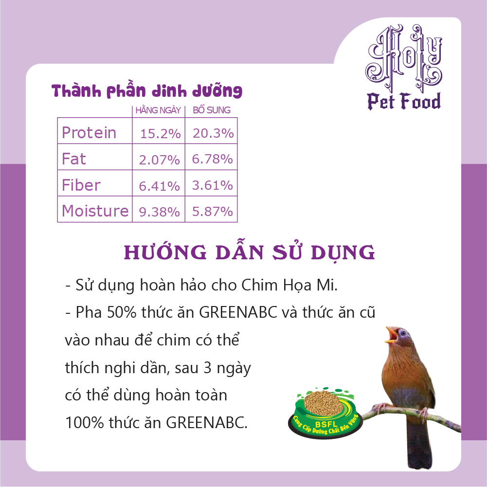 GREENABC là thức ăn cao cấp dành cho CHIM HỌA MI. Đặc biệt sản phẩm GREENABC được sản xuất theo phương pháp Áp dụng công nghệ PROTEIN bền vững từ bột đạm G.Meal rất giàu PROTEIN – CANXI – LIPID có trong BSFL, đã được Mỹ (AAFCO) và EU chấp nhận đưa vào công thức cho ngành sản xuất thức ăn dành cho vật nuôi.