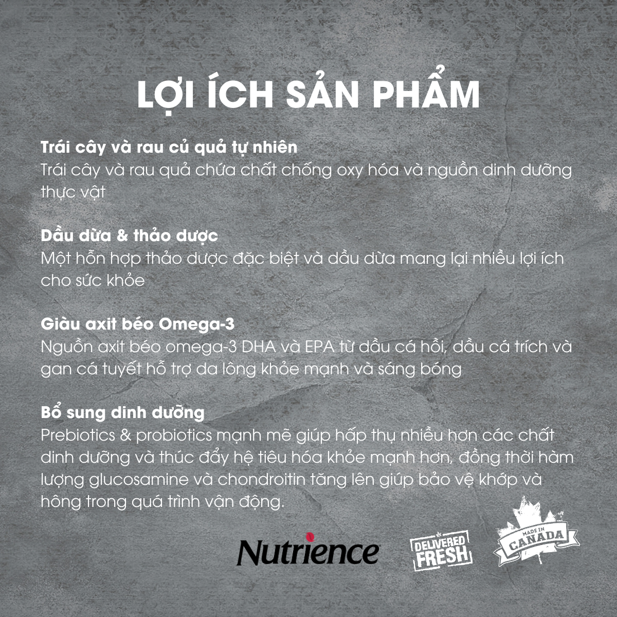 Chất béo kích thích ăn uống ngon miệng, cung cấp axit béo cần thiết Bổ sung Vitamin E và Selen giúp tăng cường hệ thống miễn dịch tự nhiên Vitamin giúp chống lão hóa, cân