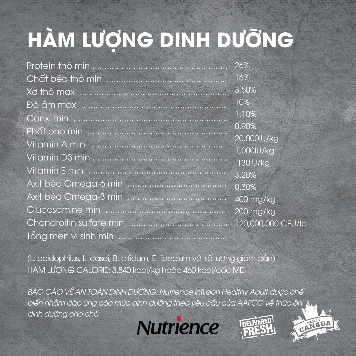 COMPOSITION/CHỈ TIÊU CHẤT LƯỢNG: Each kg contains/Trong 1 kg có chứa: Vitamin A (min) 176.350 IU Vitamin D (min) 25.200 IU Vitamin E (min) 1.060 IU Vitamin B1 (min) 352,5 mg Vitamin B2 (min) 35