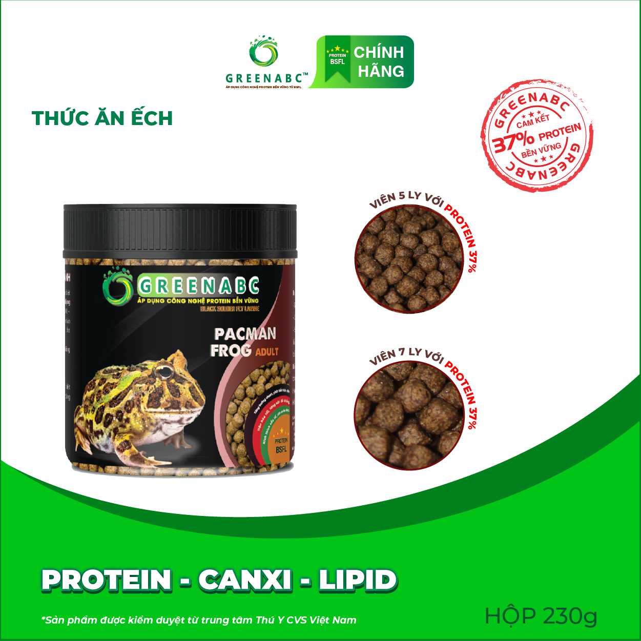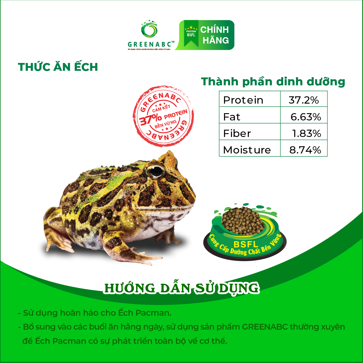 GREENABC - THỨC ĂN ẾCH PACMAN - HÀM LƯỢNG PROTEIN > 37% GREENABC là thức ăn bổ dưỡng dành cho ẾCH PACMAN. Đặc biệt sản phẩm GREENABC được sản xuất theo phương pháp Áp dụng công nghệ PROTEIN Bền Vững từ bột đạm G.Meal rất giàu PROTEIN – CANXI – LIPID có trong BSFL, đã được Mỹ (AAFCO) và EU chấp nhận đưa vào công thức cho ngành sản xuất thức ăn vật nuôi. Sản phẩm GREENABC cung cấp các giá trị dinh dưỡng bền vững cho Ếch Pacman, giúp:      + Kích thích vị giác, giúp ăn ngon miệng hơn.      + Tiêu hóa tốt, cơ thể hấp thu các dưỡng chất tối ưu. Đặc biệt với hàm lượng Protein cao, sản phẩm GREENABC giúp tăng trưởng nhanh, phát triển toàn diện.      + Kích thích sắc tố, lên màu đẹp.      + Tăng cường sức đề kháng ngăn ngừa bệnh tật.      + Cơ thể cân đối, săn chắc. Thành phần dinh dưỡng và hướng dẫn sử dụng:
