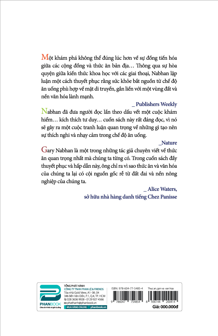 Mua tại TiktokMột khám phá không thể đúng lúc hơn về sự đồng tiến hóa giữa các cộng đồng và thức ăn bản đị Thông qua sự hòa quyện giữa kiến thức khoa học và giai thoại, Nabhan lập luận một cách thuyết phục rằng sức khỏe bắt nguồn từ chế độ ăn uống phù hợp về mặt di truyền, gắn liền với vùng đất và nền văn hóa lành mạnh." - Publishher Weekly "Nabhan đã đưa người đọc lần theo dấu vết một cuộc thám hiểích thích tư cuốn sách này rất đáng đọc, vì nó sẽ gây ra một cuộc tranh luận quan trọng về những gì tạo nên sự thích nghi và nhạy cảm trong chế độ ăn uống." - Nature "Gary Nabhan là một trong những tác giả chuyên viết về thức ăn quan trọng nhất mà chúng ta từng có. Trong cuốn sách đầy thuyết phục và hấp dẫn này, ông chỉ ra vì sao thức ăn và văn hóa của chúng ta lại có cội nguồn gốc rễ từ đất đai và nền nông nghiệp của chúng ta." - Alice Water, sở hữu nhà hàng nổi tiếng Chez Panise. Về tác giả Gary Paul Nabhan là một tác giả, nhà sinh thái học nông nghiệp, nhà thực vật dân tộc học. Các công trình của ông tập trung chủ yếu vào mối tương tác giữa đa dạng sinh học và đa dạng văn hóa ở vùng biên giới Tây Nam khô cằn. Ông được xem là người tiên phong trong phong trào ăn thức ăn địa phương và khuynh hướng giữ gìn những loại cây trông truyền thống. Ông là tác giả của: Gathering the Desert (1986) Coming Home to Eat: The Pleasures and Politics of Local Food (2002) The Desert Smells Like Rain: A Naturalist in O'odham Country (2002) Why Some Like It Hot: Food, Genes, And Culture Diversity (2004)