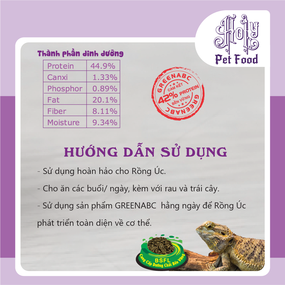 GREENABC là thức ăn cao cấp dành cho các loại Rồng Úc, Rồng Râu. Đặc biệt sản phẩm GREENABC được sản xuất theo phương pháp Áp dụng công nghệ PROTEIN BỀN VỮNG từ bột đạm G.Meal rất giàu PROTEIN–CANXI–LIPID có trong BSFL*, đã được Mỹ (AAFCO) và EU chấp nhận đưa vào công thức cho ngành sản xuất thức ăn dành cho thú cưng.