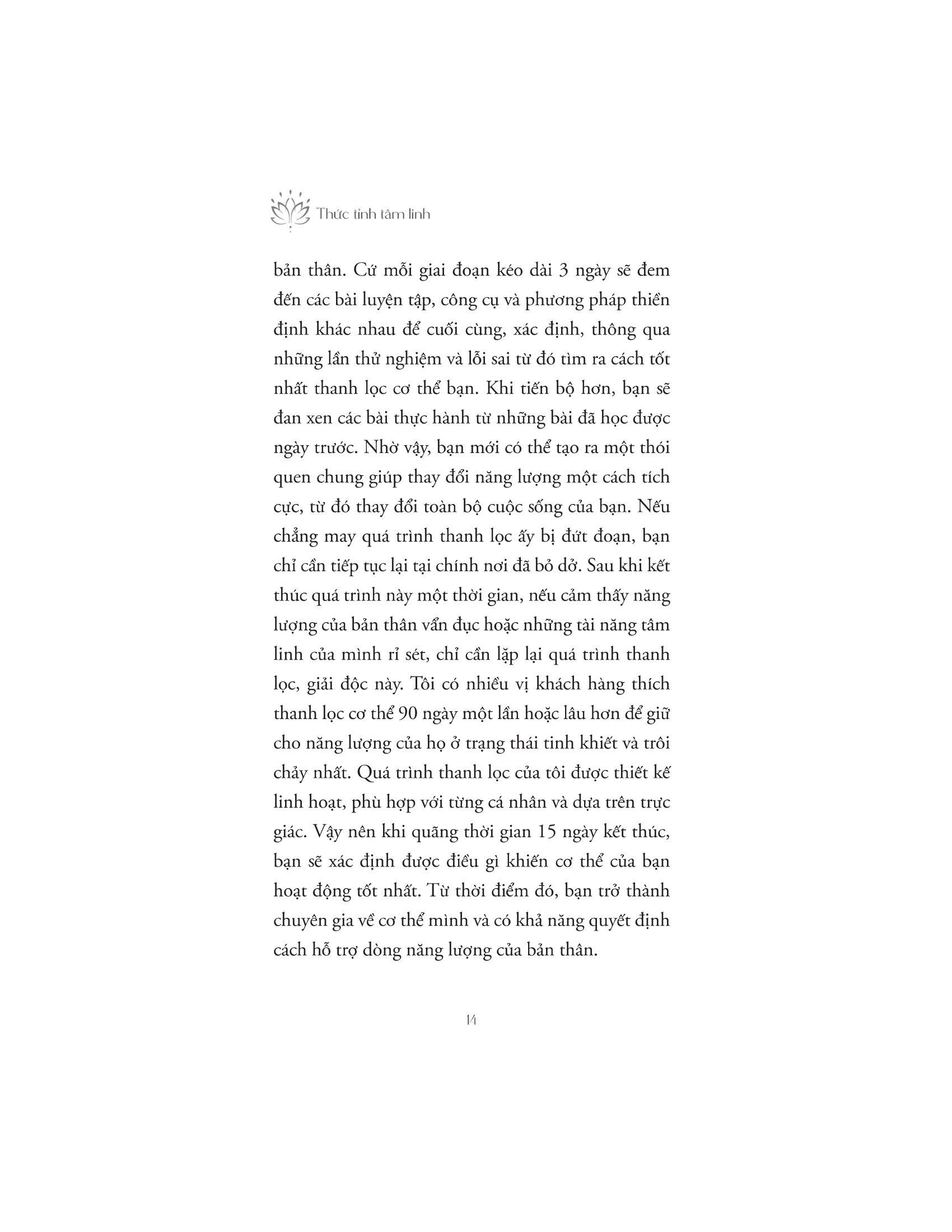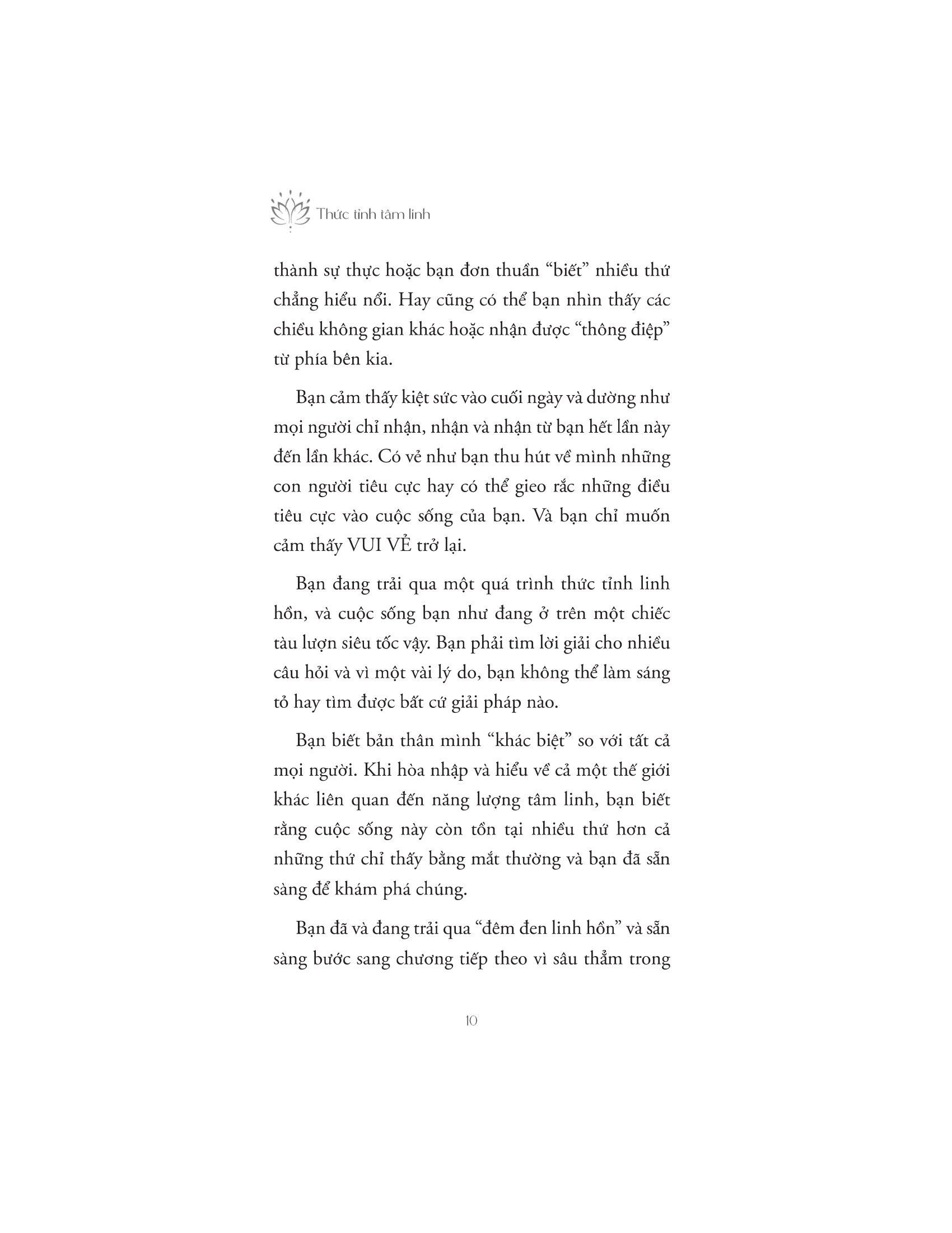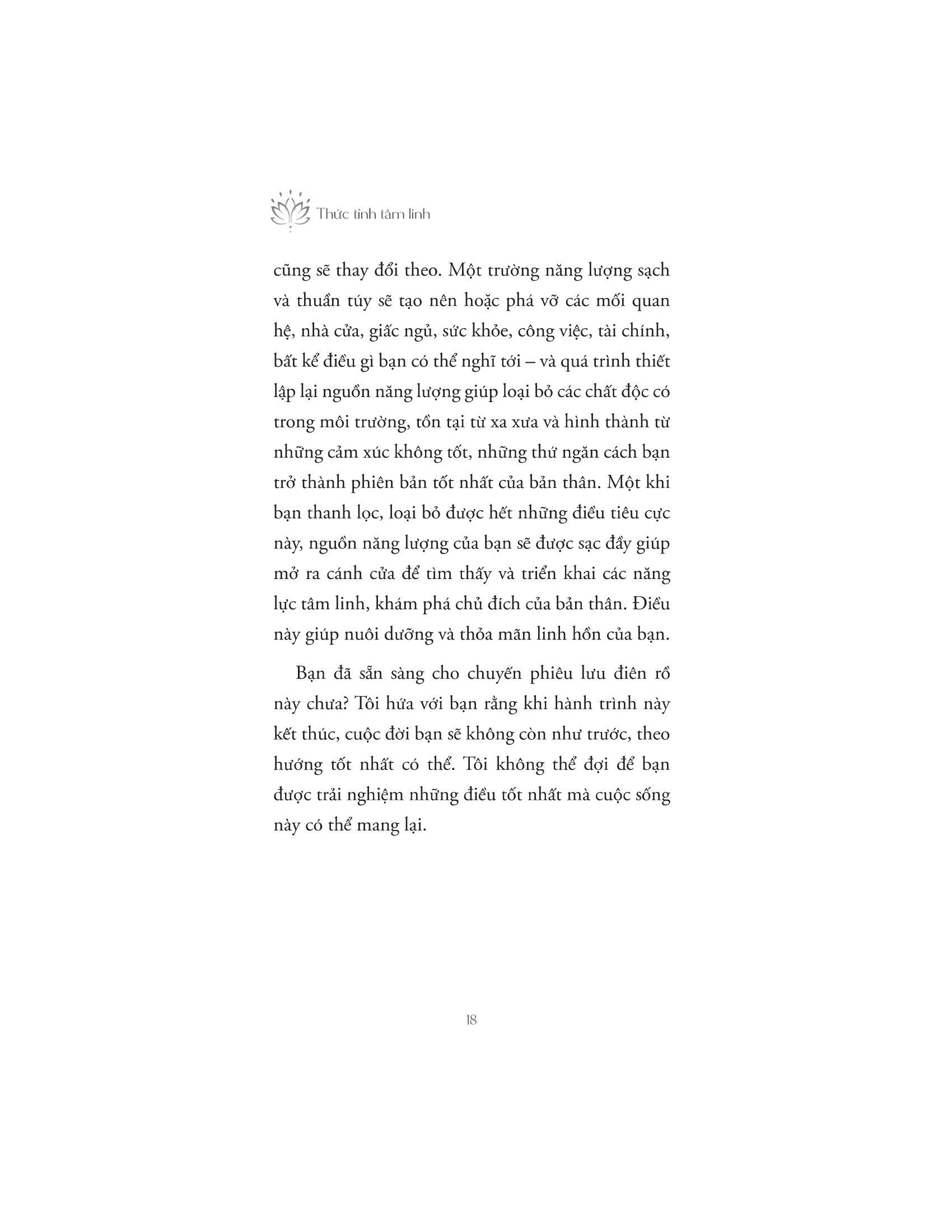 Hãy để Thức tỉnh tâm linh – Đánh thức năng lượng bản thân, khai mở tâm trí, thu hút tiền bạc, sống đời trọn vẹn dẫn dắt bạn vào hành trình thức tỉnh tâm trí trong 15 ngày để đánh thức những tài năng tiềm ẩn ấy. Sử dụng món quà của bản thân vì chính m.ình và vì mọi người là mục tiêu cao cả nhất, không chỉ thay đổi cuộc sống của bạn mà còn cả của những người xung quanh theo chiều hướng tốt đẹp hơn.