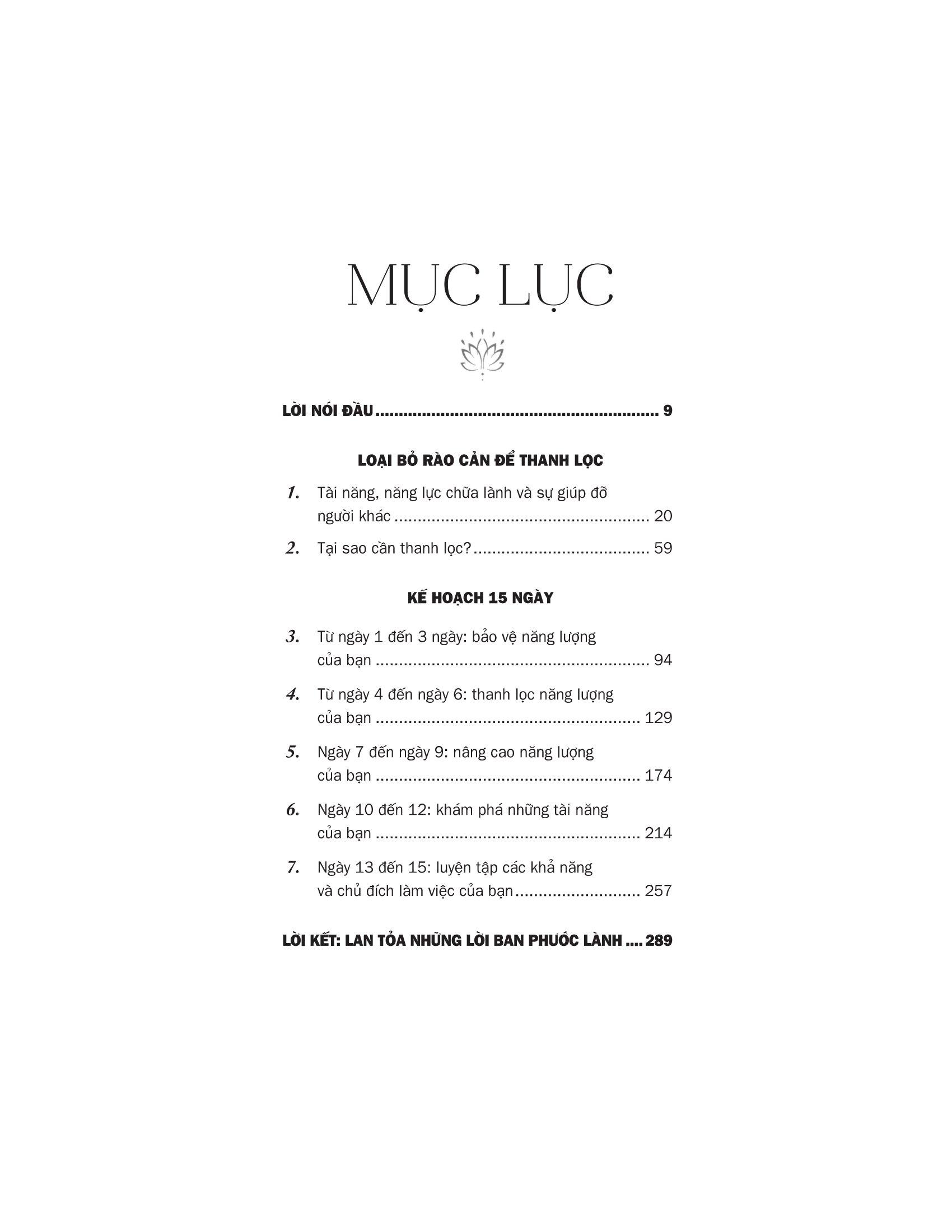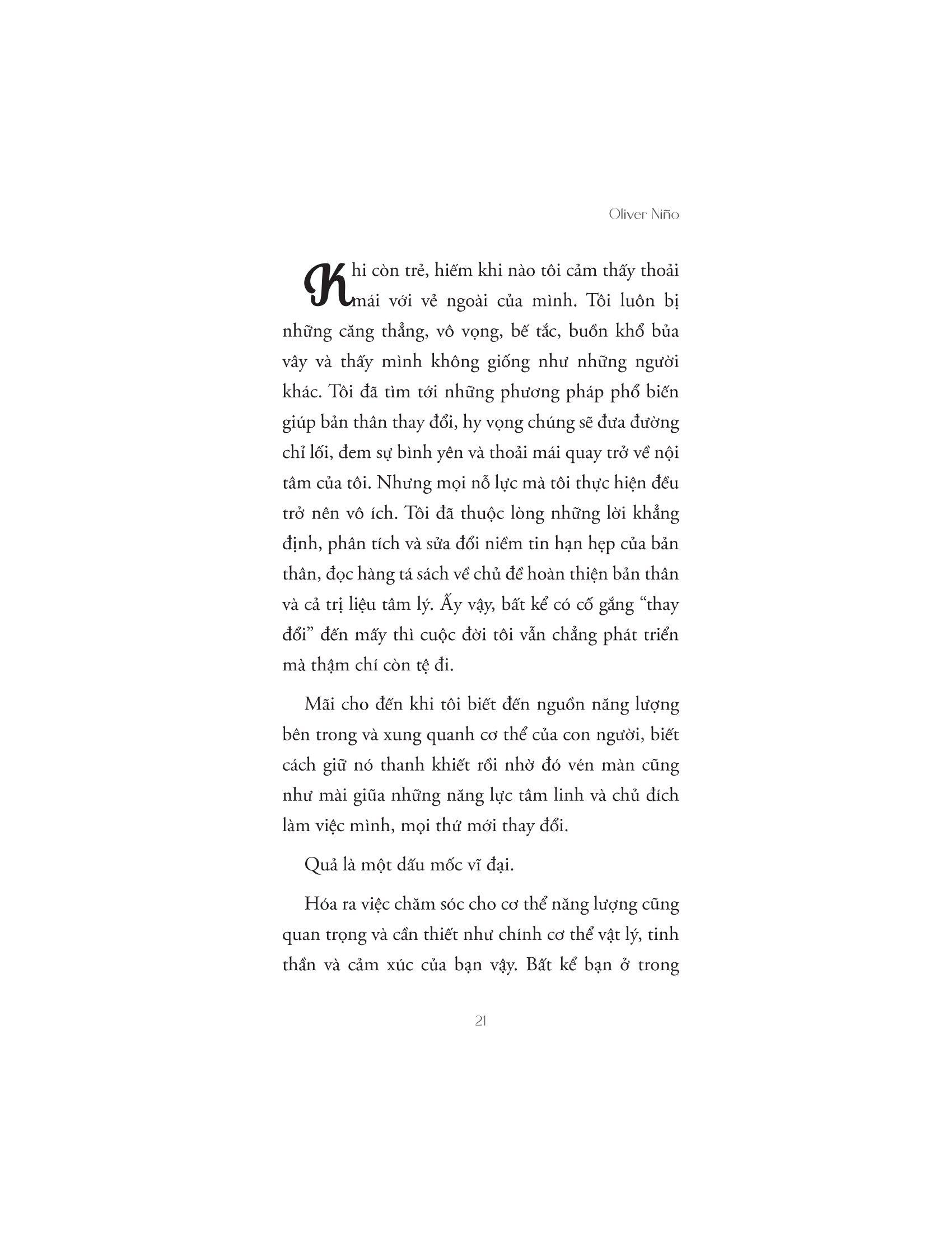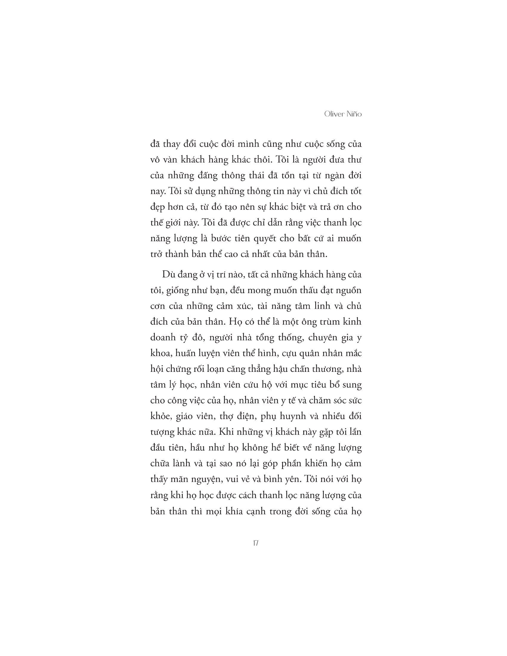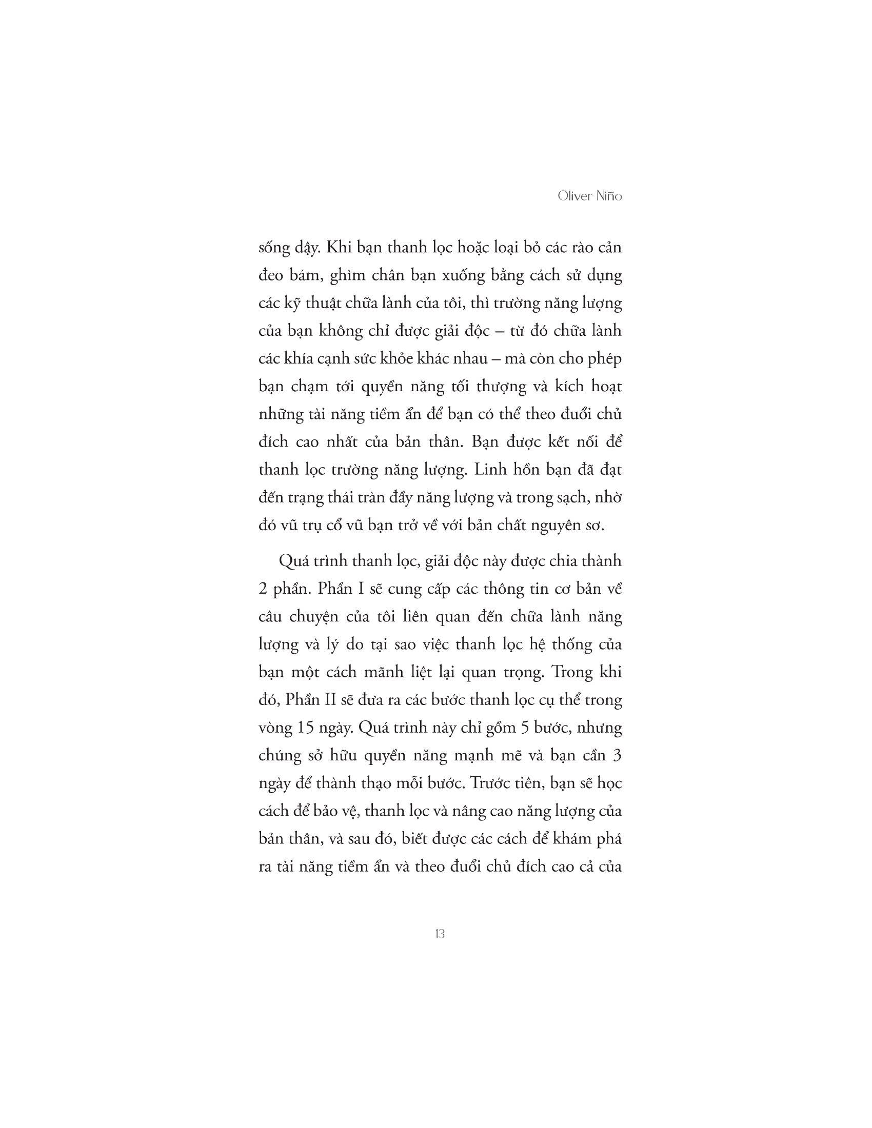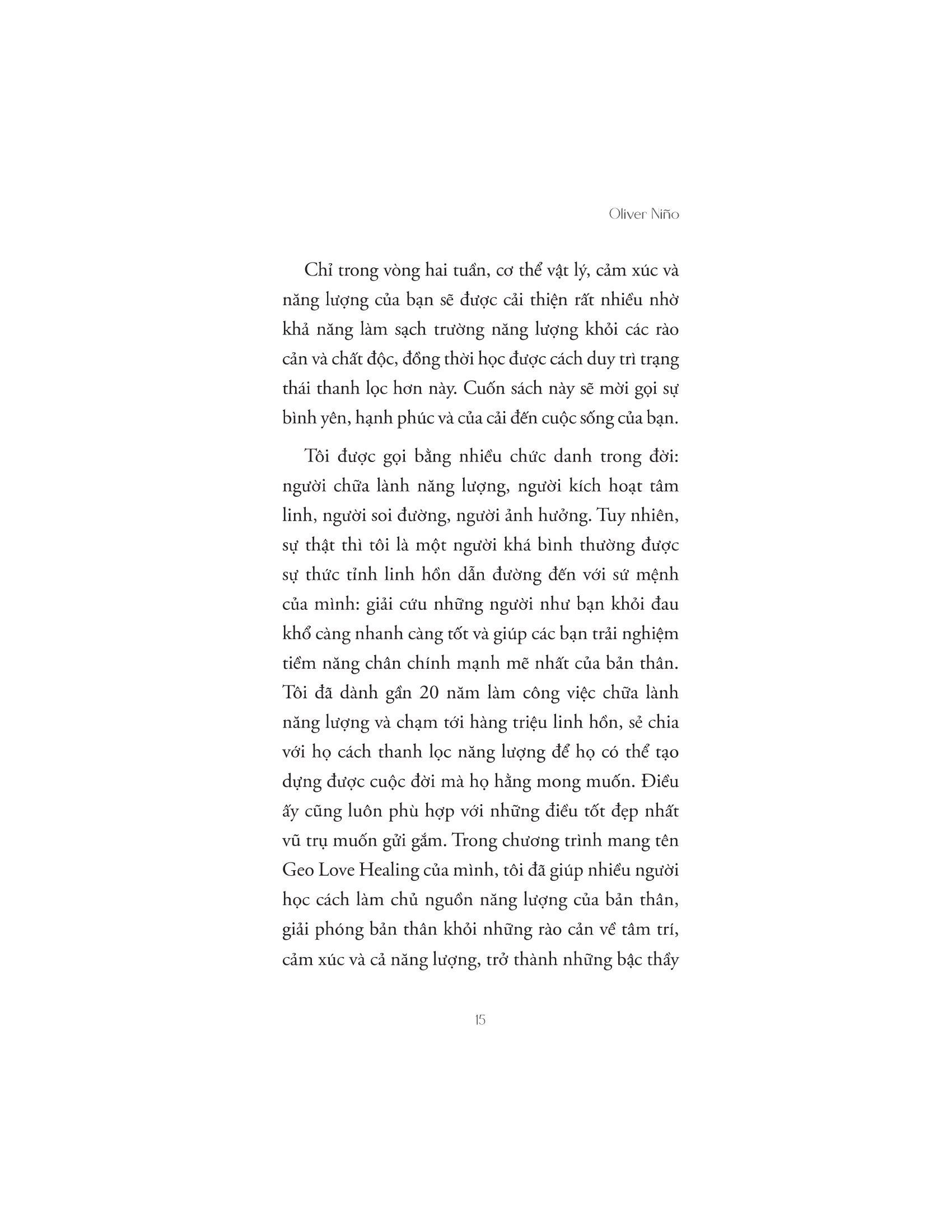 Sau nhiều năm thực hiện công việc tư vấn và chữa lành cho hàng nghìn khách hàng khác nhau, tác giả Oliver Niño đã đúc kết các kinh nghiệm sử dụng thiền, khai mở luân xa và nâng cao tần số rung cảm để cải thiện sức khỏe và cuộc sống của m.ình thành một bảng hướng dẫn chi tiết nhất về quá trình tự chữa lành và khai phá tiềm năng của bản thân chỉ trong 15 ngày. Cuốn sách này sẽ hướng dẫn chi tiết cách tìm kiếm gốc rễ của những vấn đề đang kìm kẹp bạn, hay chính là những cảm xúc tiêu cực, những ám ảnh trong quá khứ, thậm chí chúng có thể bắt nguồn từ thời ông bà của bạn di truyền lại; sau đó học cách bảo vệ tâm trí khỏi những ký ức này và từng bước sống tích cực để duy trì một trường năng lượng cao hơn. Ở tần số năng lượng cao, bạn có thể chữa lành bản thân cũng như kêu gọi một tương lai tươi sáng hơn cùng với những con người, sự việc có chung mức tần số cao đó.