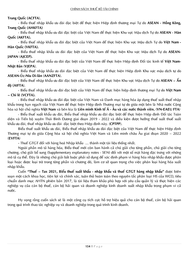 - Biểu thuế xuất khẩu ưu đãi, Biểu thuế nhập khẩu ưu đãi đặc biệt để thực hiện Hiệp định Đối tác Toàn diện và Tiến bộ xuyên Thái Bình Dương giai đoạn 2019 - 2022 và điều kiện được hưởng thuế suất thuế xuất khẩu ưu đãi, thuế nhập khẩu ưu đãi đặc biệt theo Hiệp định này. (CPTPP). Biểu thuế xuất khẩu ưu đãi, Biểu thuế nhập khẩu ưu đãi đặc biệt của Việt Nam để thực hiện Hiệp định Thương mại tự do giữa Cộng hòa xã hội chủ nghĩa Việt Nam và Liên minh châu Âu giai đoạn 2020 – 2022 (EVFTA) - Thuế GTGT đối với hàng hoá Nhập khẩu … thành một tài liệu thống nhất. Ngoài phần mô tả hàng hóa, Biểu thuế mới còn ban hành cả chú giải cho từng phần, chú giải cho từng chương, chú giải bổ sung (Supplementary explanatory notes - SEN) đối với một số mặt hàng đặc trưng với những mô tả cụ thể. Đây là những chú giải bắt buộc phải sử dụng để xác định phạm vi hàng hóa nhập khẩu được phân loại hoặc được loại trừ trong từng phần và chương đó, làm cơ sở quan trọng cho việc phân loại hàng hóa xuất nhập khẩu. Cuốn “Thuế – Tax 2021, Biểu thuế xuất khẩu - nhập khẩu và thuế GTGT hàng nhập khẩu” được biên soạn một cách khoa học, tiện lợi và chính xác, tuân thủ hoàn toàn theo nguyên tắc phân loại HS của WCO, tiêu chuẩn danh mục AHTN phiên bản 2017, là tài liệu tham khảo phù hợp với yêu cầu quản lý và thực hiện các nghiệp vụ của cán bộ thuế, cán bộ hải quan và doanh nghiệp kinh doanh xuất nhập khẩu trong phạm vi cả nước. Hy vọng rằng cuốn sách sẽ là một công cụ tích cực hỗ trợ hiệu quả cho cán bộ thuế, cán bộ hải quan trong quá trình thao tác nghiệp vụ và doanh nghiệp trong quá trình kinh doanh.